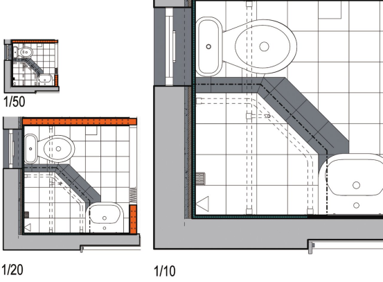 再以图3.25浴室平面为例进一步说明Revit线宽控制系统的意义。墙体剖切线在对象样式中设置线宽值为5,不同比例平面对比可看出线宽设置的作用。1∶10图面中墙体剖切线显示宽度为1mm,1∶20及1∶50图面中线宽值略小为0.7mm,但已可以明显看出当前比例线宽值已影响到墙体饰面层的表达,如果线宽是被一个统一数值控制,比如1mm,这种情况会更加严重。当然,1∶20及1∶50图面并不需要显示墙体结构细节,Revit也有相应的设置来控制比例与图面复杂程度的关系(见图3.26)。这个例子很清晰地解释了Revit线宽设置背后的逻辑。