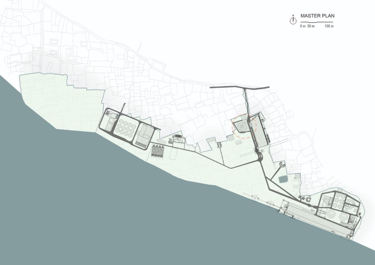 建筑体被圆形的半户外空间所包围。这个露天空间是主厅内光线和空气的来源。建筑的底部空间开放,将室内和周围环境连接起来。可操作的玻璃门允许空气通过室内,使空间保持凉爽和舒畅。圆形的半户外空间被高墙包围,以阻挡熙熙攘攘的重工业外环境的细微影响。半户外周围的景观逐渐倾斜,使建筑体与周围环境融为一体。这种上扬的景观创造了一个下沉式庭院,建筑群坐落其间。在繁华和嘈杂的工业活动中,这个庭院依旧保持平静和安宁。作为一个整体,该建筑形式给出了一个新的形象,或者说开发了一种新的清真寺语言,它更多地是一种转变,简单但独特,大胆又同时融于环境之中