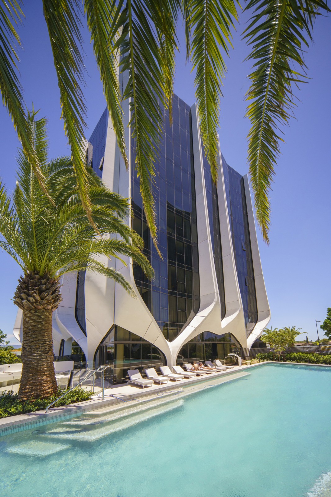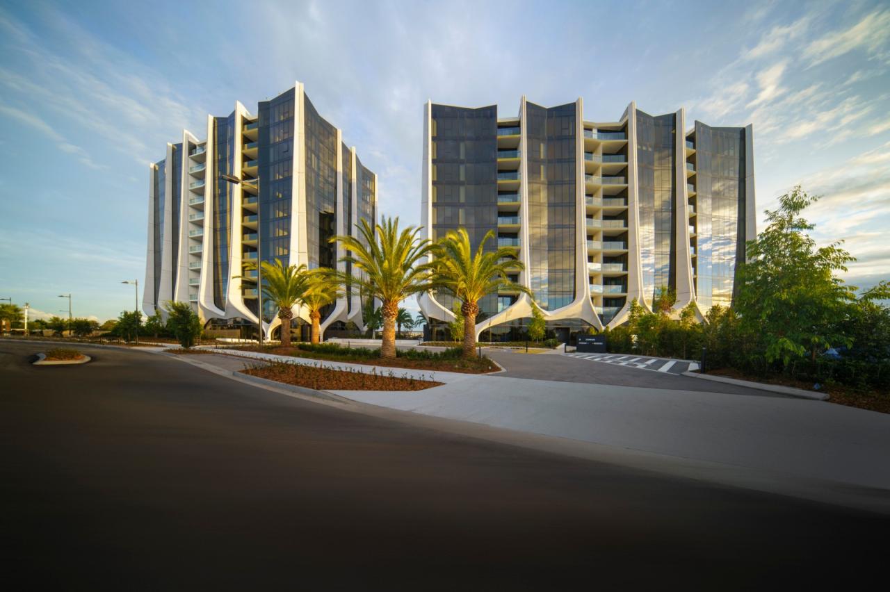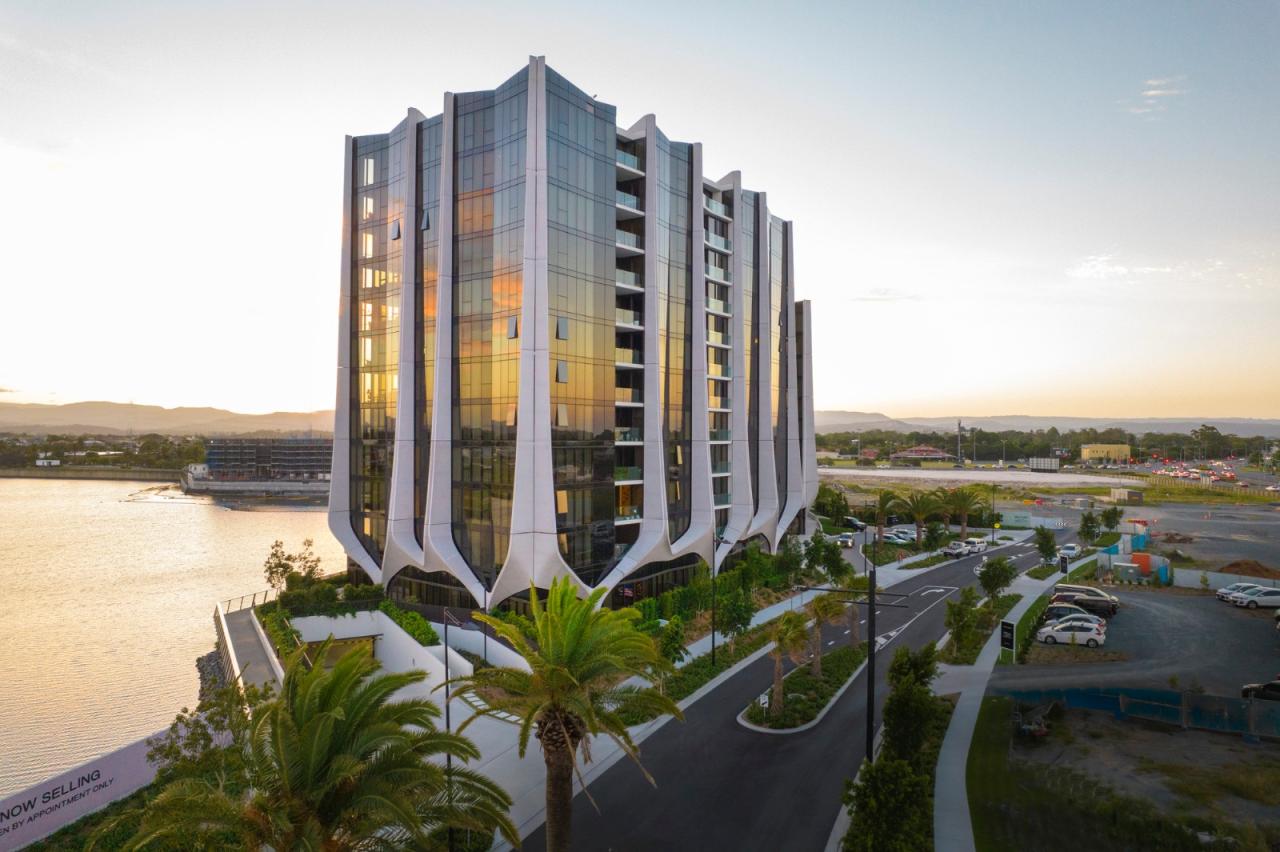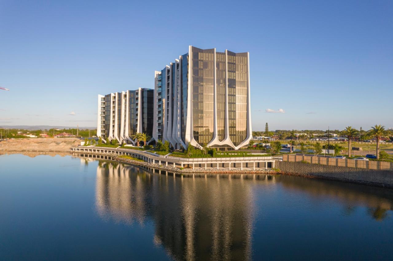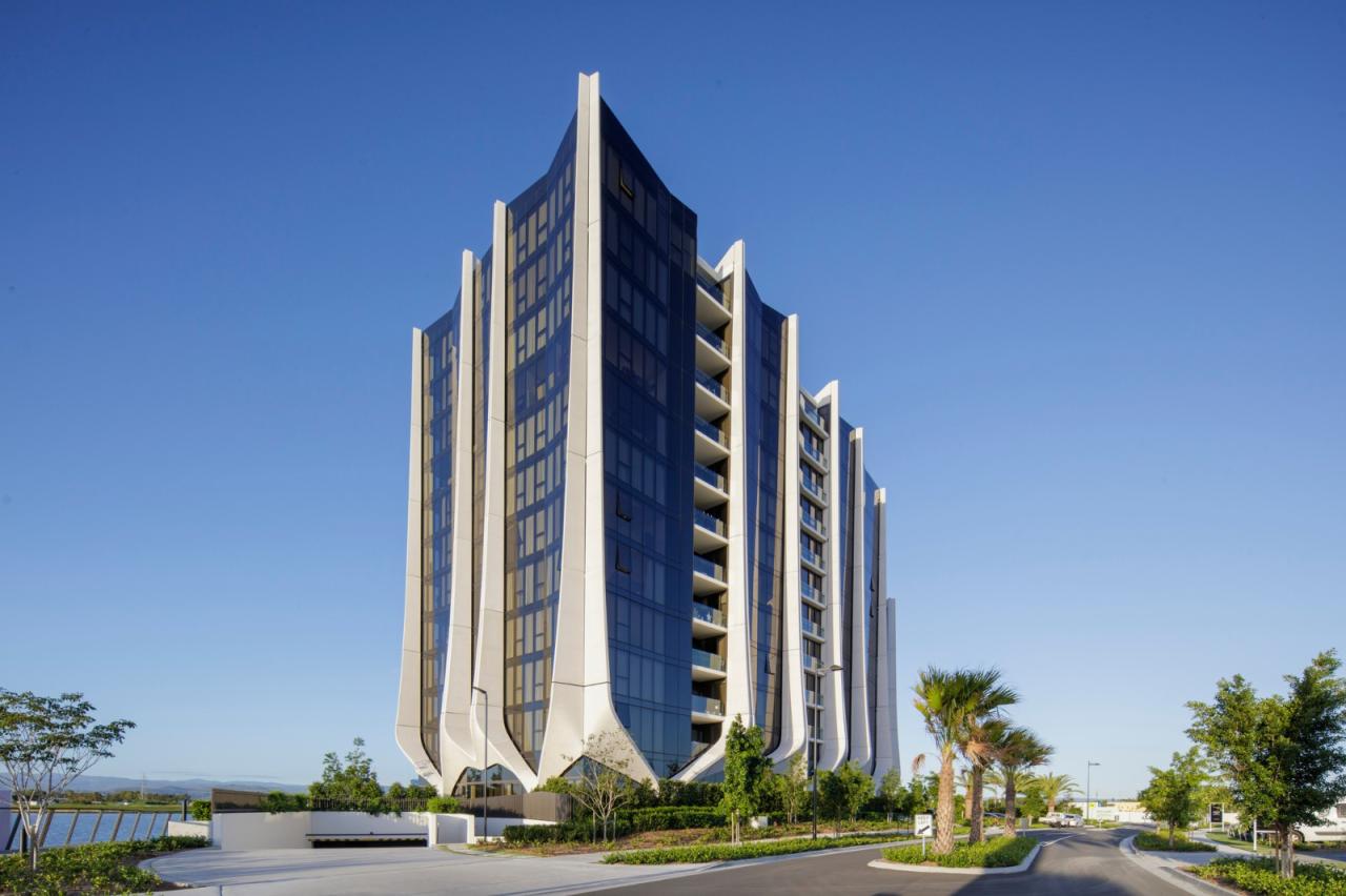 The Lanes 公寓位于澳大利亚黄金海岸上一个显眼的拐角位置,其富有艺术感的造型可以调和沿海高层建筑与内陆本土建筑之间的矛盾。四座塔楼住宅用流动的建筑语言模仿大地的轮廓和植物的生长,在城区与 Unity 湖的景观之间起到了平衡的作用。