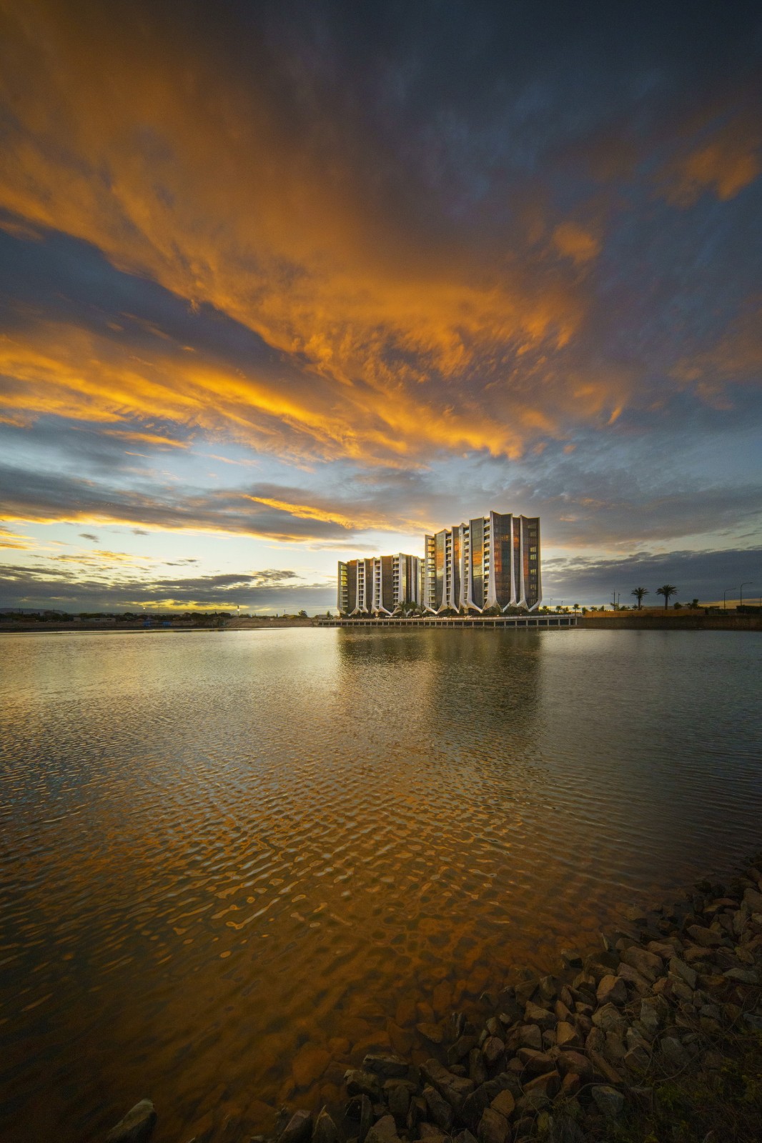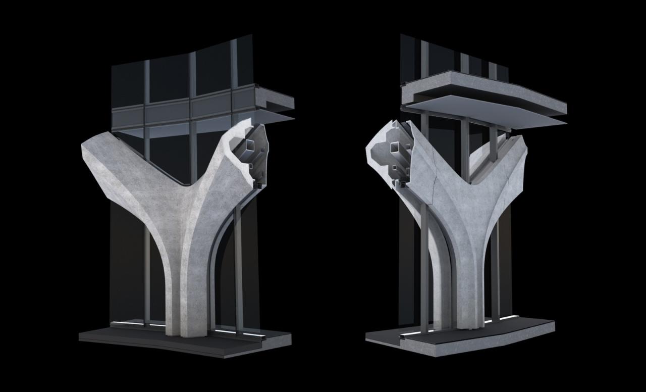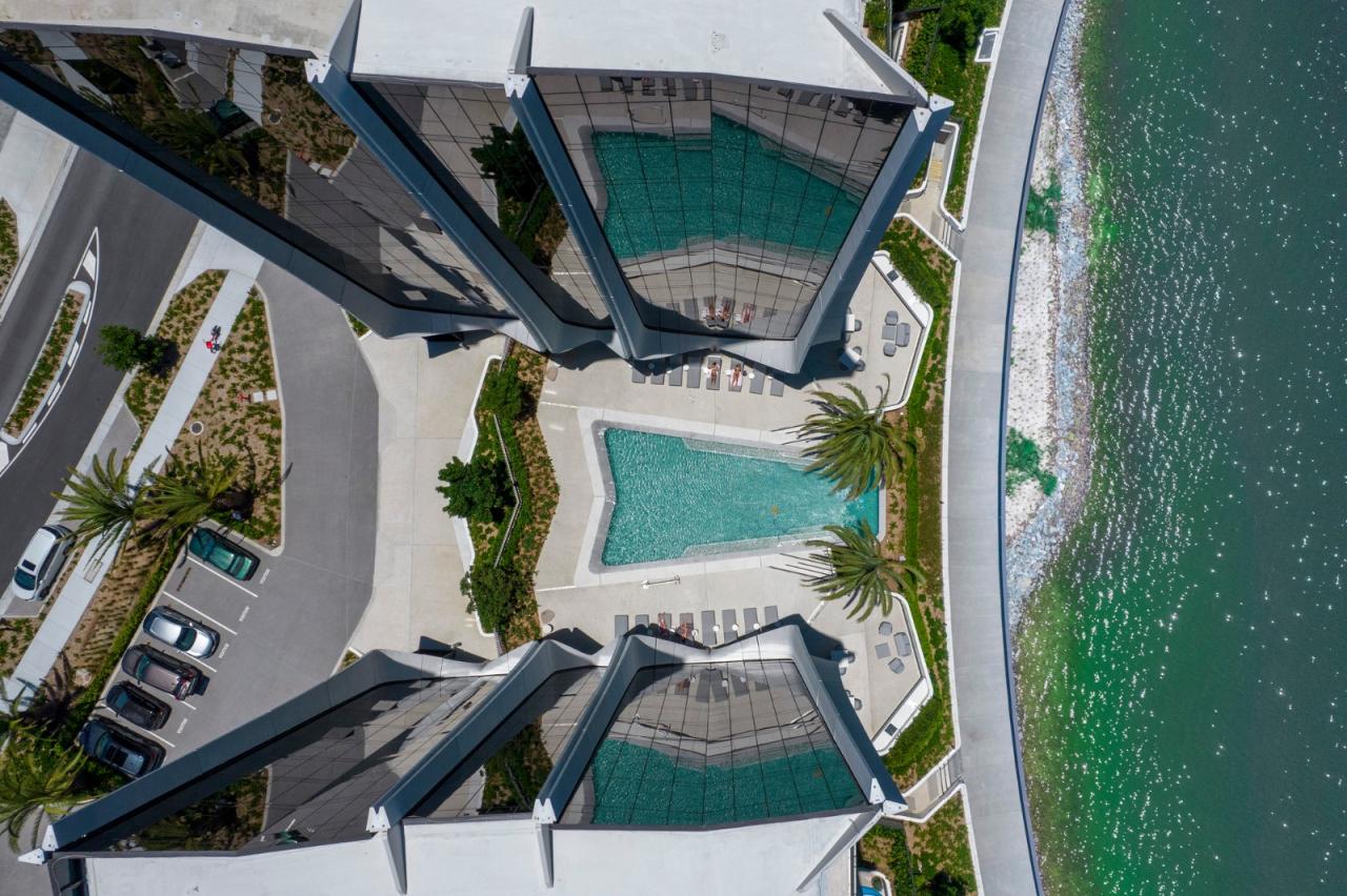 建筑结构在立面上得以体现。玻璃纤维增强混凝土的垂直柱体组成的外骨架斜交向上,支撑起四座塔楼,并为切面玻璃墙提供部分遮阴效果。两座 10 层高的塔楼包含底层零售和商业空间(将与未来的零售村相连),两座 12 层高的塔楼设有居民设施,包括游泳池、露台、桑拿、水疗、健身房、游戏厅和会议室。