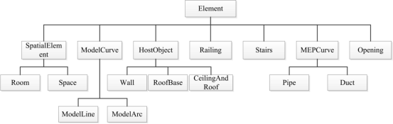 元素对于Revit模型至关重要,Revit呈现给用户的模型界面对象大多都是由元素组成,比如墙、族、族类型、族实例等实例化的对象,当然对于软件的一些操作,如模型的移动、选取、旋转等操作,也有对应的实例化对象能够选择。在Revit模型中墙、地板、屋顶、柱、标注等都拥有对应的类,这些类一般都继承于Element,如图1所示。