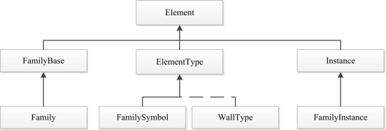 对于族类见图2,表示了族、族类型和族实例之间的关系,族对应Family,族类型对应FamilySymbol,例如墙、柱、门等各自不同类型对应不同的族类型,族实例FamilyInstance