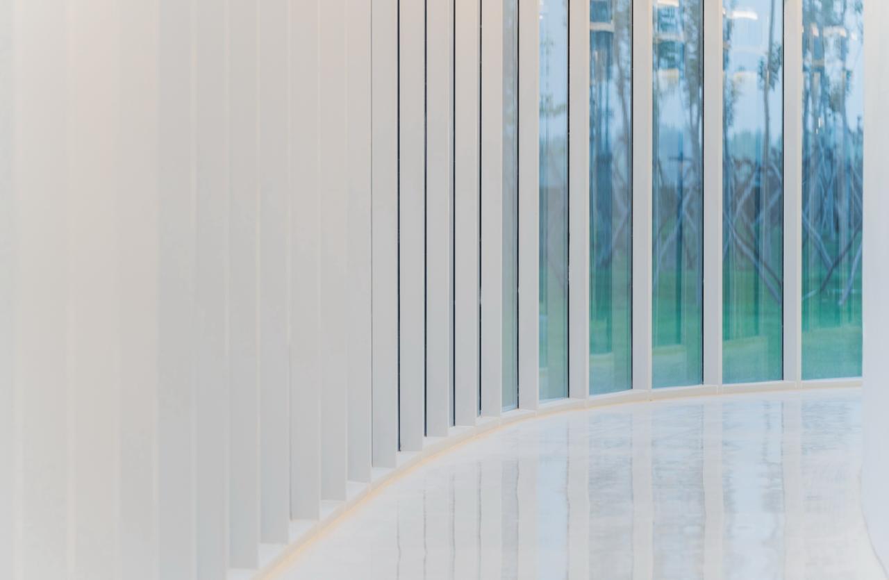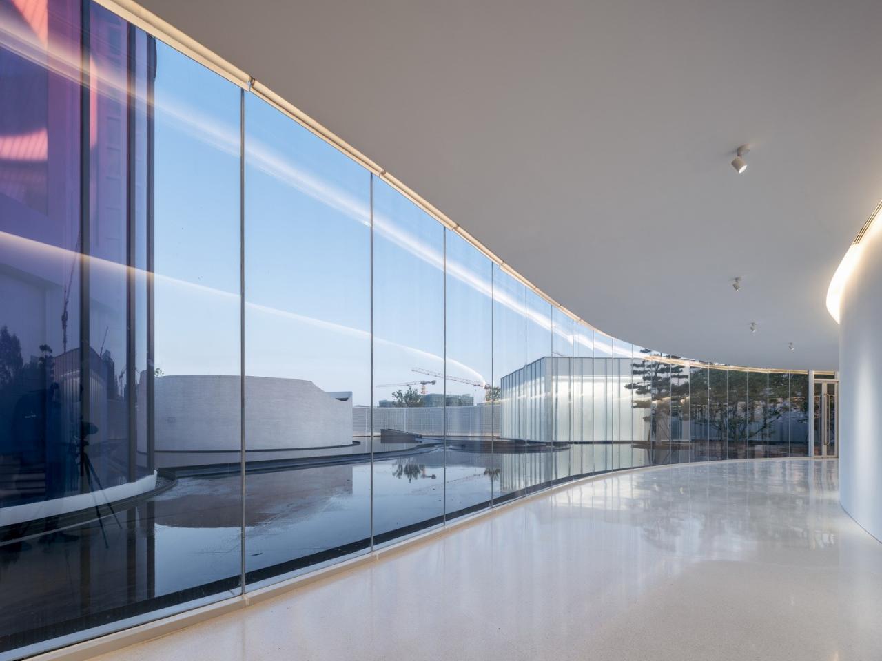 独白美术馆是个复合功能的场所。可以让不同人同时在里面的不同空间却可以一个人以一种艺术方式独处。平面形式复杂并且不规则,在结构设计上不利抗震。不过将美术馆拆分来看,除艺术长廊平面为弯曲的带状异形外,矩形舞蹈室、圆形瑜伽室、椭圆形小剧场都是抗震性能优异的对称规则的布局。老胡就此设置了三道抗震缝将其分成四个独立的结构单元。超长结构的伸缩变形得到了释放,减小了温度应力,避免气温变化引起出现结构裂缝。不得不接受抗震缝的我只好仔细设计节点,掩盖它在屋顶,立面以及室内的存在,保证我的画卷在视觉上是连续不断的。
