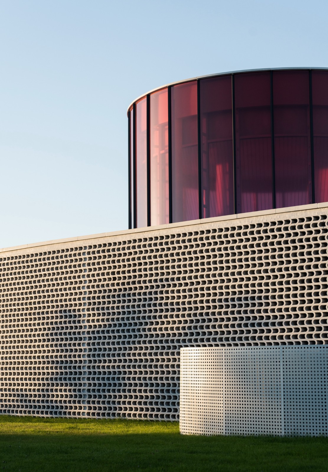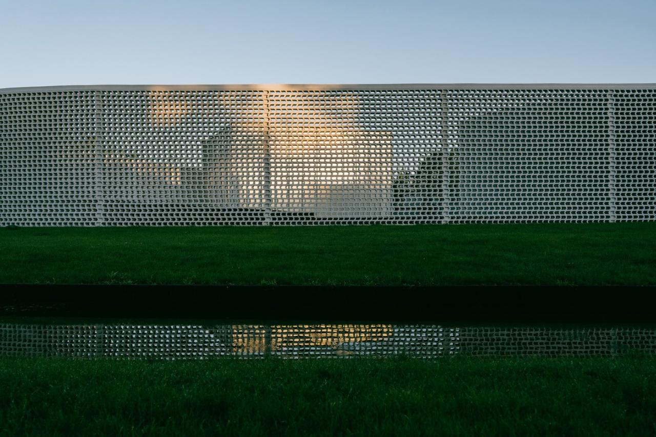 要让5米高的花墙连续展开同时又要保证安全,就需要在花墙背后每3.8米加设构造柱。同时屋面板悬挑作为砖墙的压顶。镂空花砖是采用预混法3%钢纤维含量制作而成的GRC砖,有两个型号组合形成立面花纹。花砖墙或者以双墙独立成为院墙,或者和玻璃或者和实墙形成一组连续150米长光影变化的界面来包裹独白美术馆。