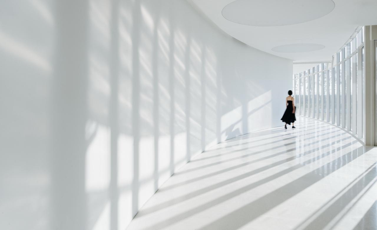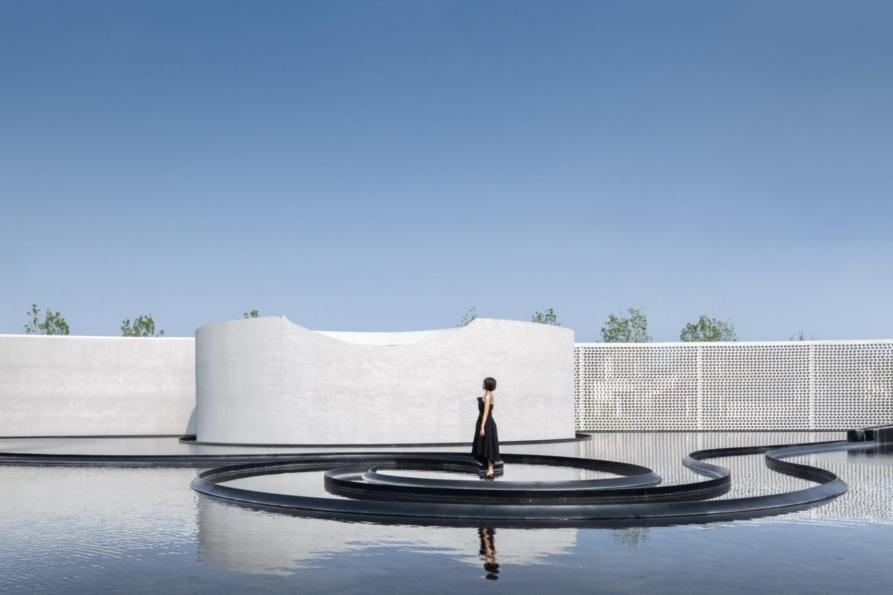 中国画最具艺术特色的是线条。利用毛笔不同部位在纸面上形成挺括有弹性或者柔和松弛,浓淡干湿,粗细变化但连绵不断的线条。这样的线条不仅是有空间也是有速度的。我把独白美术馆的边界看成这么一条变化的墨线。在建筑中我用白色代替黑色创作。起笔是椭圆形的小剧场。点是瑜伽室,枯笔是花墙,艺术长廊是联系这些的笔划,细的有些快的是走廊,用的是笔尖,然后变成侧峰形成慢的粗的线条就是放大的美术馆,再慢慢回到笔尖用笔一顿就是舞蹈教室。一开始的长廊和美术馆外侧封闭内侧对水院开放,而之后则是内侧封闭外侧对大景观开放,这就是运笔。