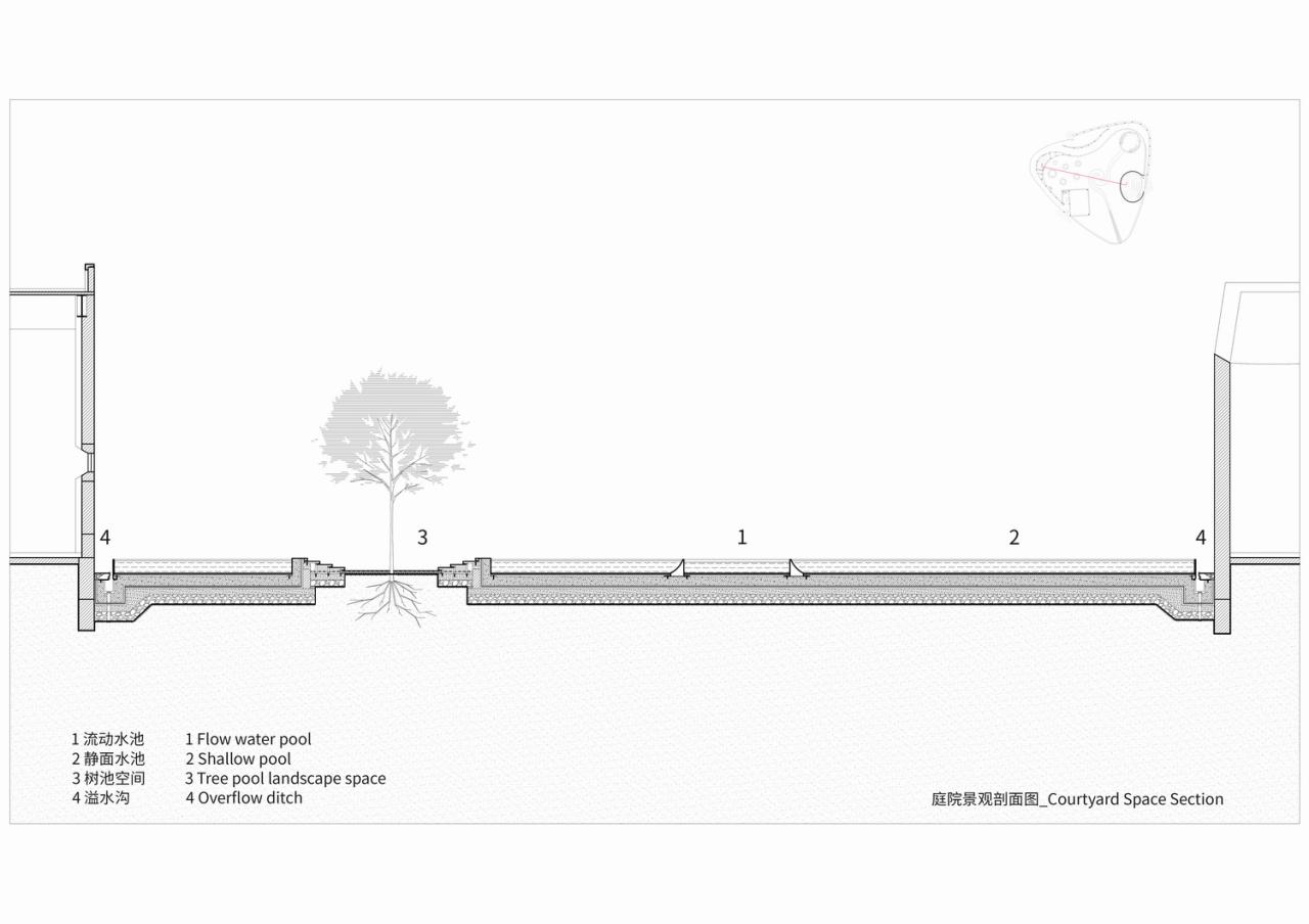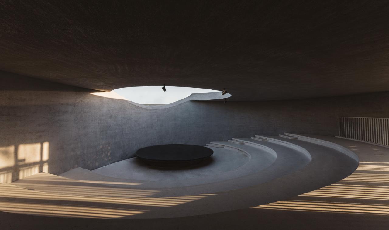 小剧场其实就是独白美术馆的门厅。为了减少计算容积率的建筑面积。它被设计成灰空间。同时为了让观众的注意力集中在表演并不愿意剧透中央水景,小剧场被设计成封闭空间。我在舞台后上方切了一个弧形天窗,让日光或者月光如瀑布洒落下来,“万物皆有罅隙,那是光照进来的地方。”
