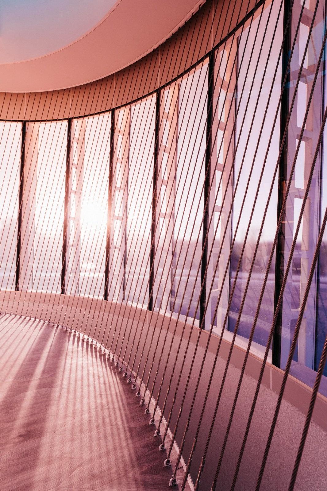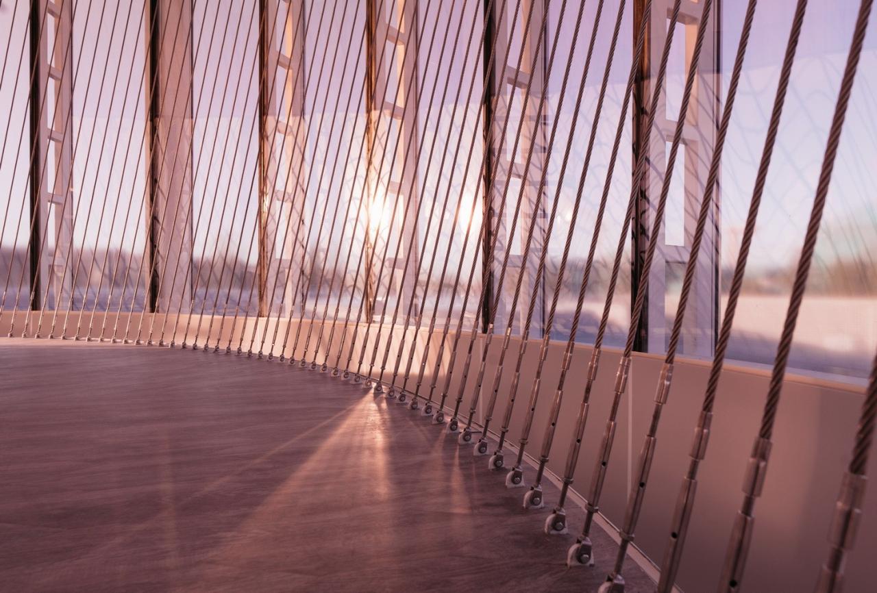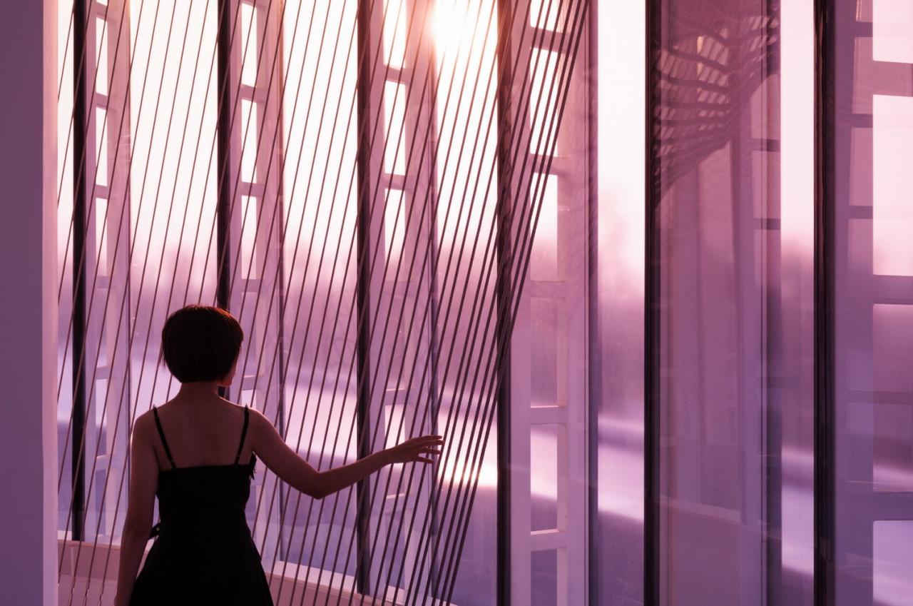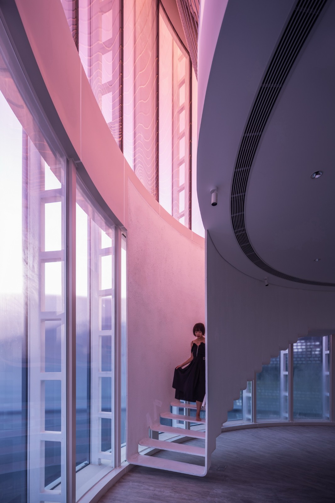 玻璃堡垒原本只有一层,但运行方坚持要有更衣,我只能设置两层。保证一楼的视觉开敞,就把更衣放在了二楼。我也希望外立面玻璃保持垂直连续性。我要求二楼的楼板和玻璃立面脱开。我对老胡说,吊起来吧。老胡在屋面以十字形布置框架提供水平侧向刚度,结合周边环形布梁形成框架提供抗扭刚度,形成清晰高效的受力体系,他用4根悬挂于主框架梁上并内收可以隐藏在衣柜之中的吊柱把二楼楼板吊了起来。最后一不做二不休,楼梯也以悬挂的方式轻巧地挂在楼板上。于是一楼变迎着华丽的光线而开放。