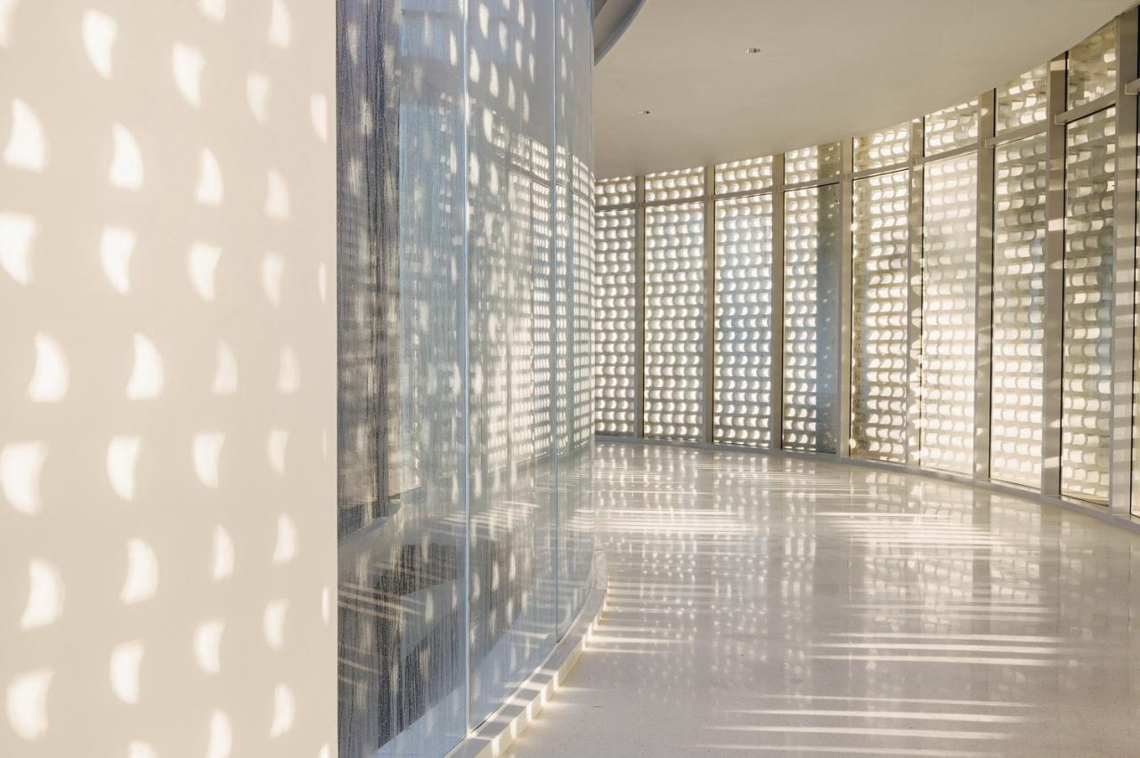 独白美术馆的内外墙材料分别为玻璃,实墙和花墙。三者独立或者组合连续如同变化的墨线形成了美术馆的忽明忽暗的边界。花墙就是枯笔。