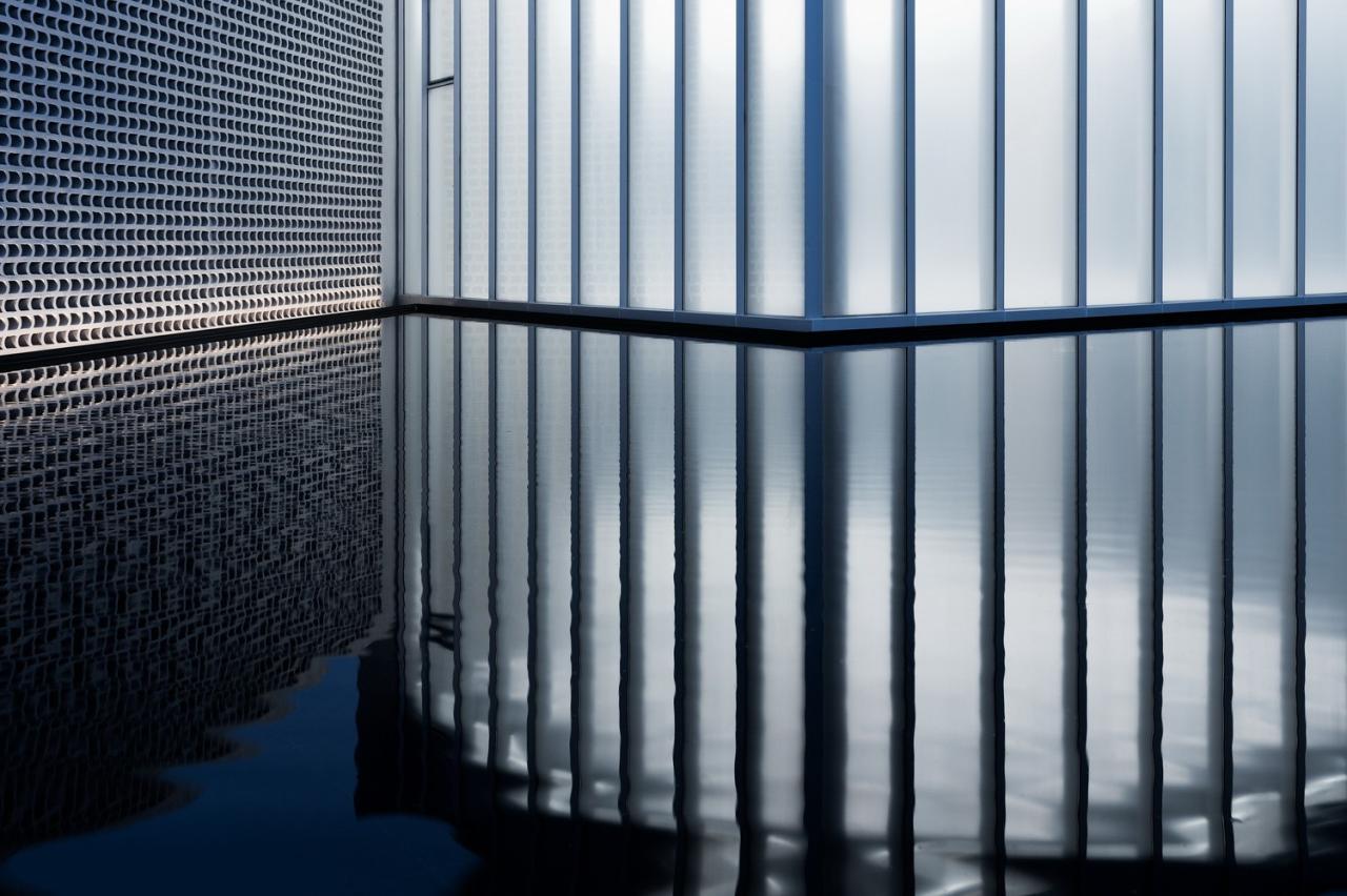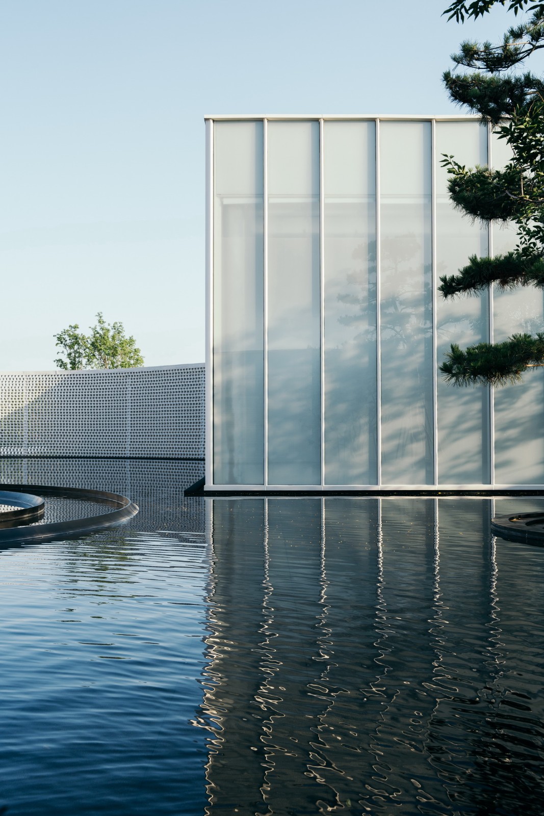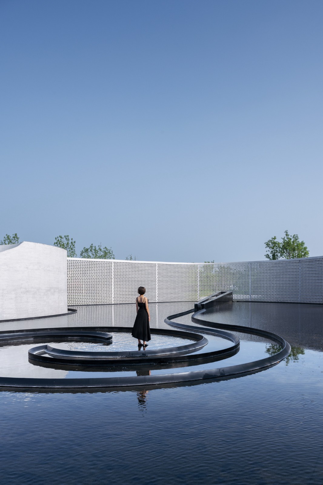 庭院原来是设计成白色干粘石地面。它可以让整个建筑呈现一种漂浮感,这在我白昼奇境的项目中成功实验过,能创造出一种不真实的幻觉。当我推敲六君子图的呈现时,改变了想法,我不想追求一种略甜的梦幻而试图表达一种经过思考有些惆怅的心情。六君子图是以大面积的留白表达了浩淼的水面而使得画面不受尺幅限制却呈现出旷远平静的气势。就此我决定变白为黑,将可进入的白色广场变成能看的黑色水池。在视觉上制造了新的深度。这样一来,白色建筑环抱着一眼沉默的深潭,你凝视着他,他也凝视着你。周围的建筑霎时安静下来。只有风吹过六君子的沙沙声。
