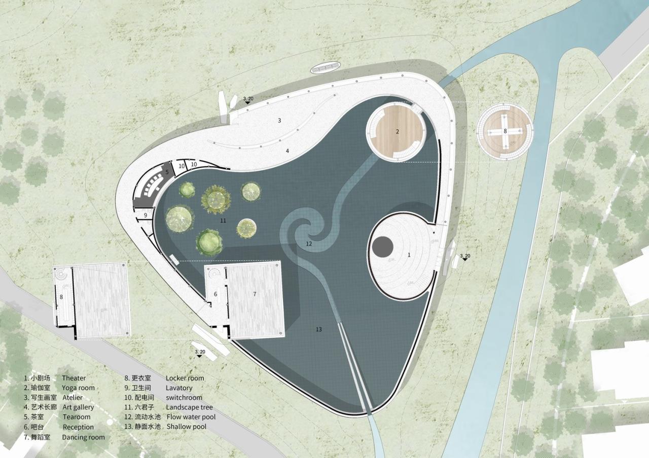 水院安静是安静下来了。课当我看着效果图中黑色水池边上矗立着有着玻璃幕墙立面的白色建筑时,又产生了一种新的熟悉感,这个场所气氛过于陈词滥调。于是我决定俞挺化,把最高的圆形瑜伽室外立面变成渐变的彩色玻璃。在浓墨中点彩,她就是熠熠生辉的玻璃堡垒。