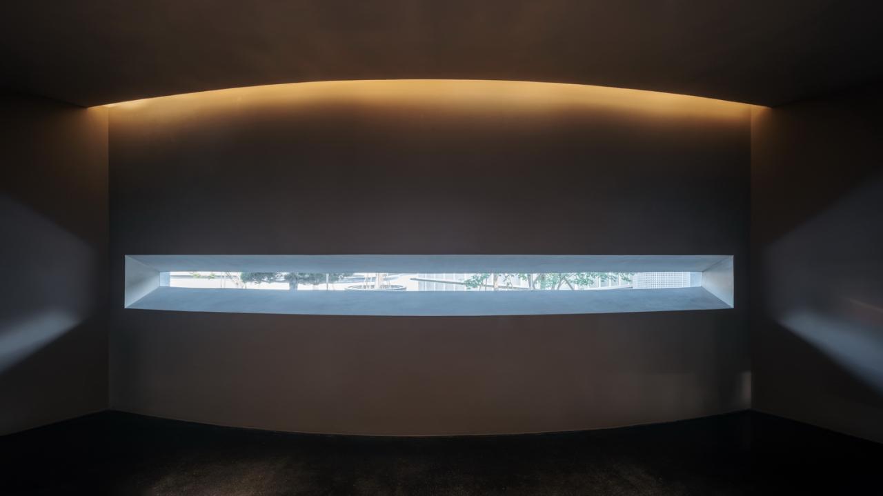 我把单墙一分为二形成的类似墨线中的飞白作为藏在走廊背景墙后面的茶室。这是一个私密沉默的空间。一个藏着心思的角落。我沿着视线高度开了一条长长的窗子。于是六君子便如画卷徐徐展现出来。“相看两不语,俄而已忘机,”