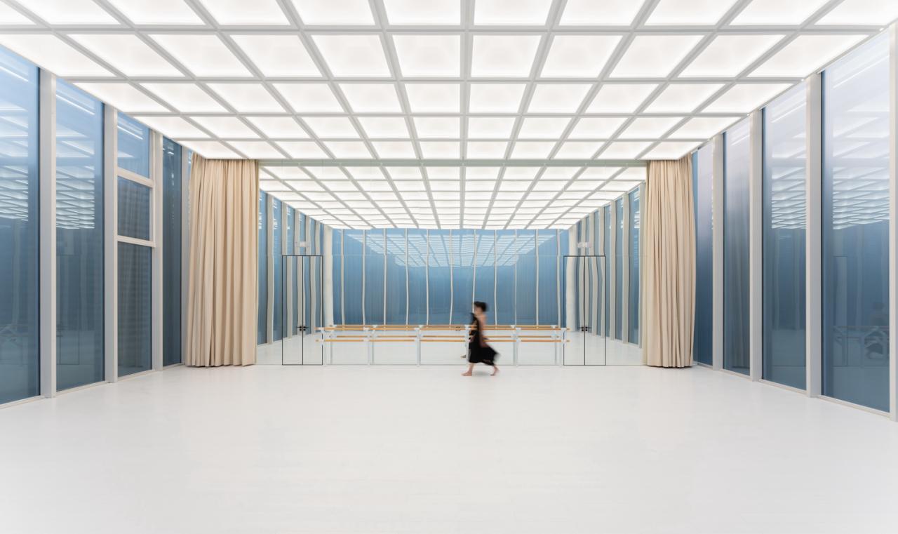 2009年我参观赫尔佐格设计的伦敦的一间舞蹈学校。总监客气地对我说舞蹈演员训练的时候希望光线充足。而所谓美丽风景以及彩色立面会干扰演员的内观的情绪。我把独白美术馆的舞蹈教室设计成半透明的玻璃盒子,有着足够的光照但把户外的风景滤掉成为舞蹈教室的背景。教室的镜墙背后是入口门厅以及在夹层里的更衣。演员就可以在纯粹的天和地之间表达自己。