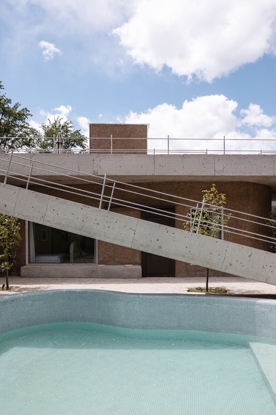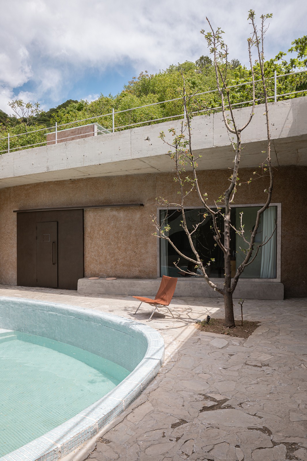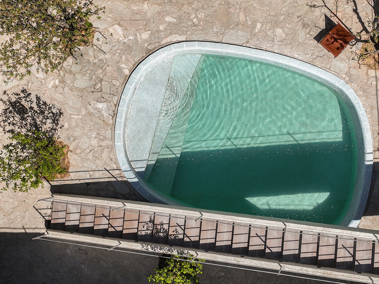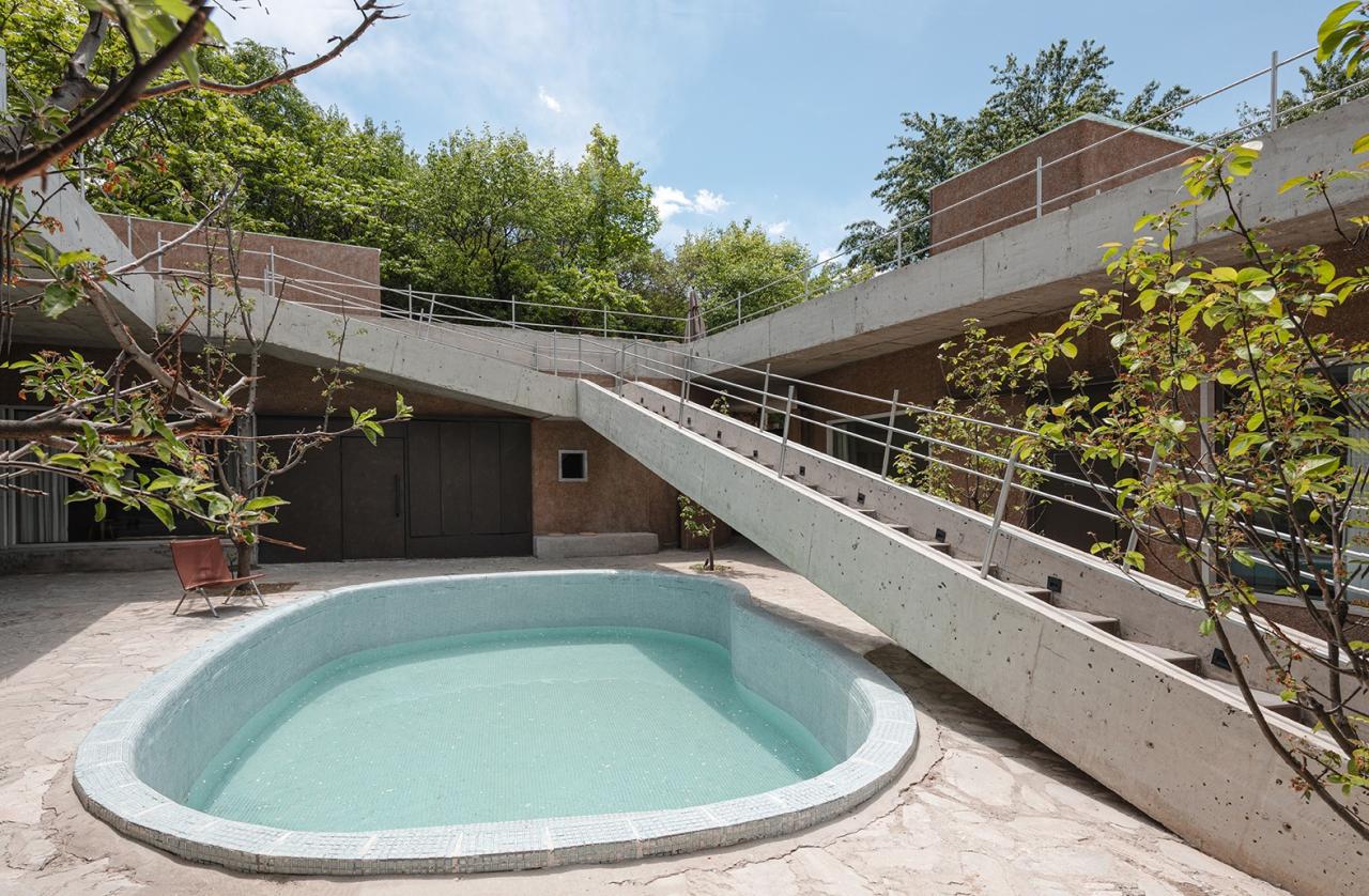 院中泳池边上是连接院子与屋顶的长梯,泳池的四分之一在长梯之下,二者形成了对话关系,人们走上长梯路过泳池到达屋顶,过程中速度可快可慢。