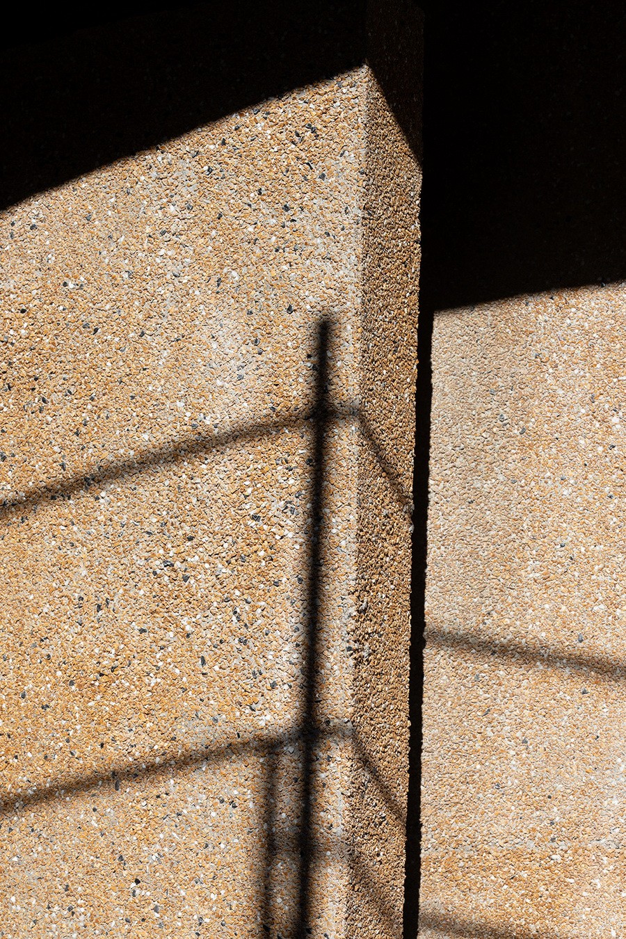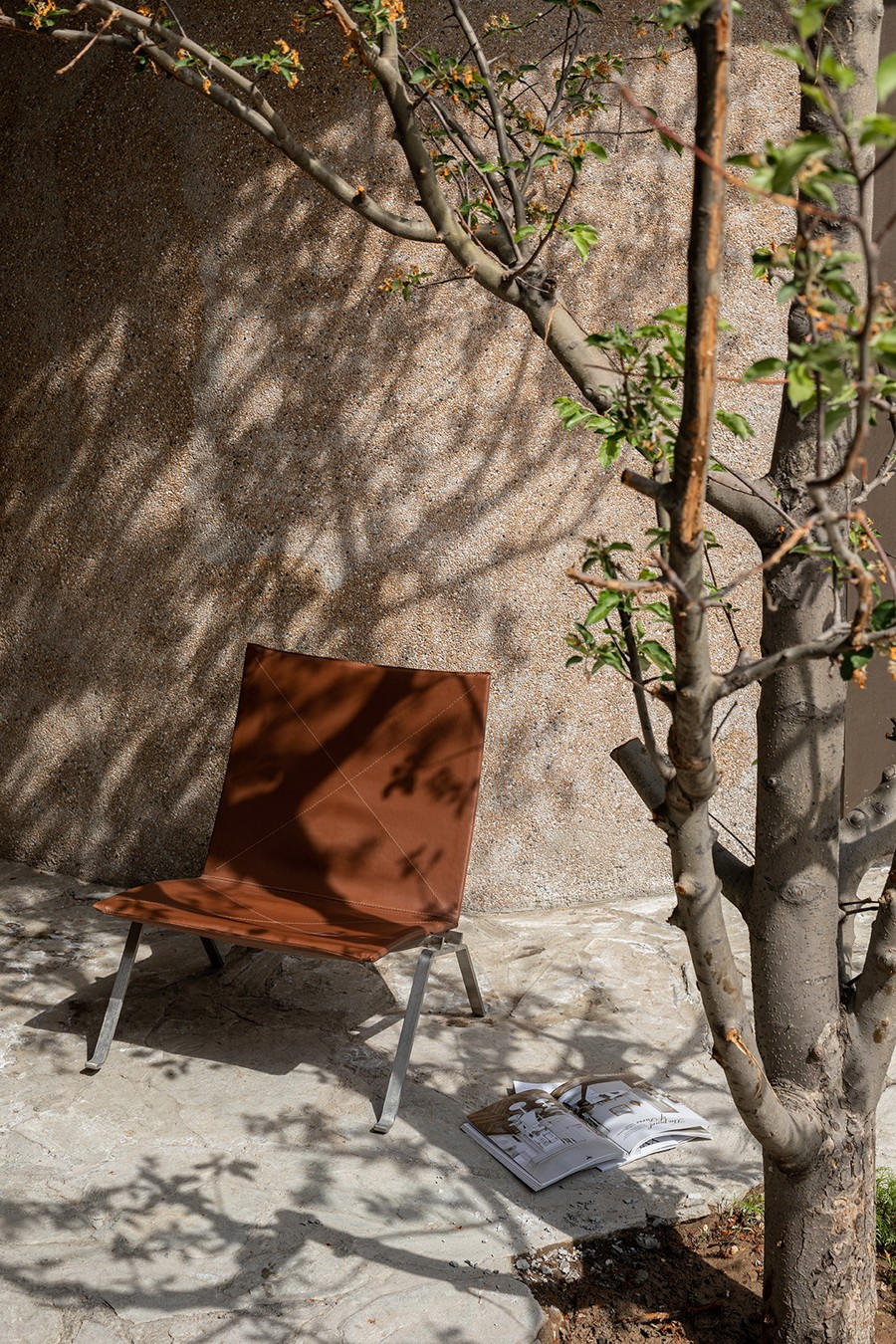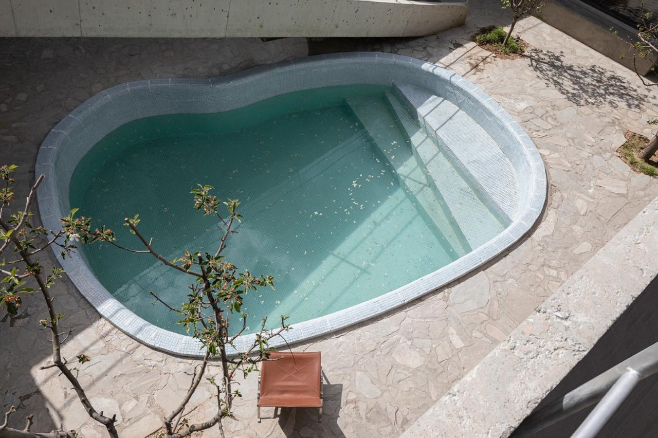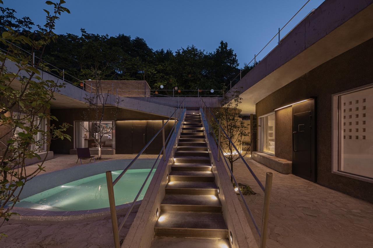 院中泳池边上是连接院子与屋顶的长梯,泳池的四分之一在长梯之下,二者形成了对话关系,人们走上长梯路过泳池到达屋顶,过程中速度可快可慢。