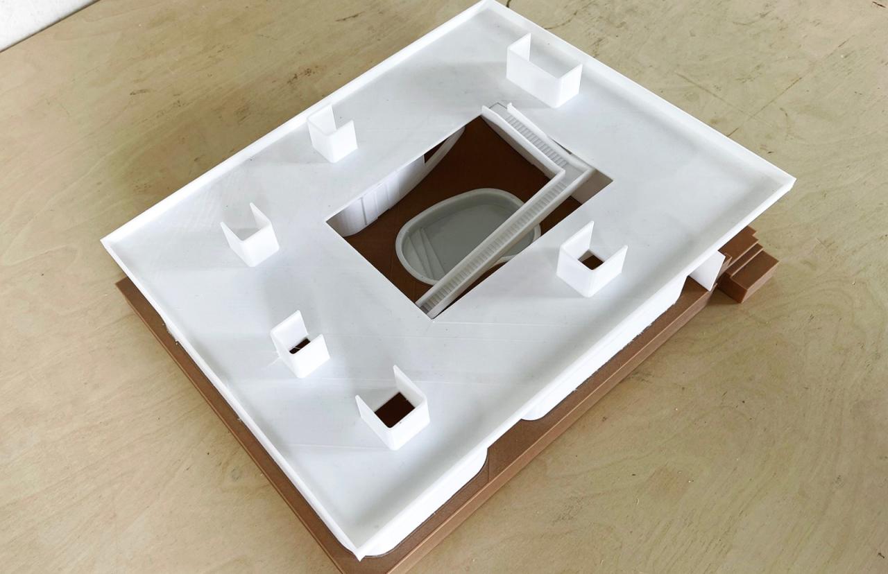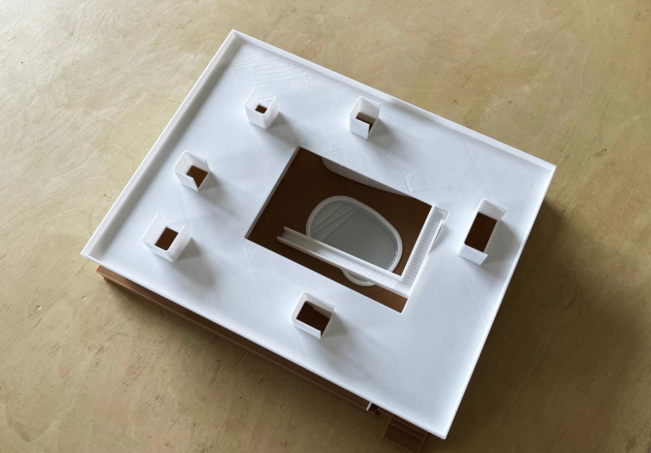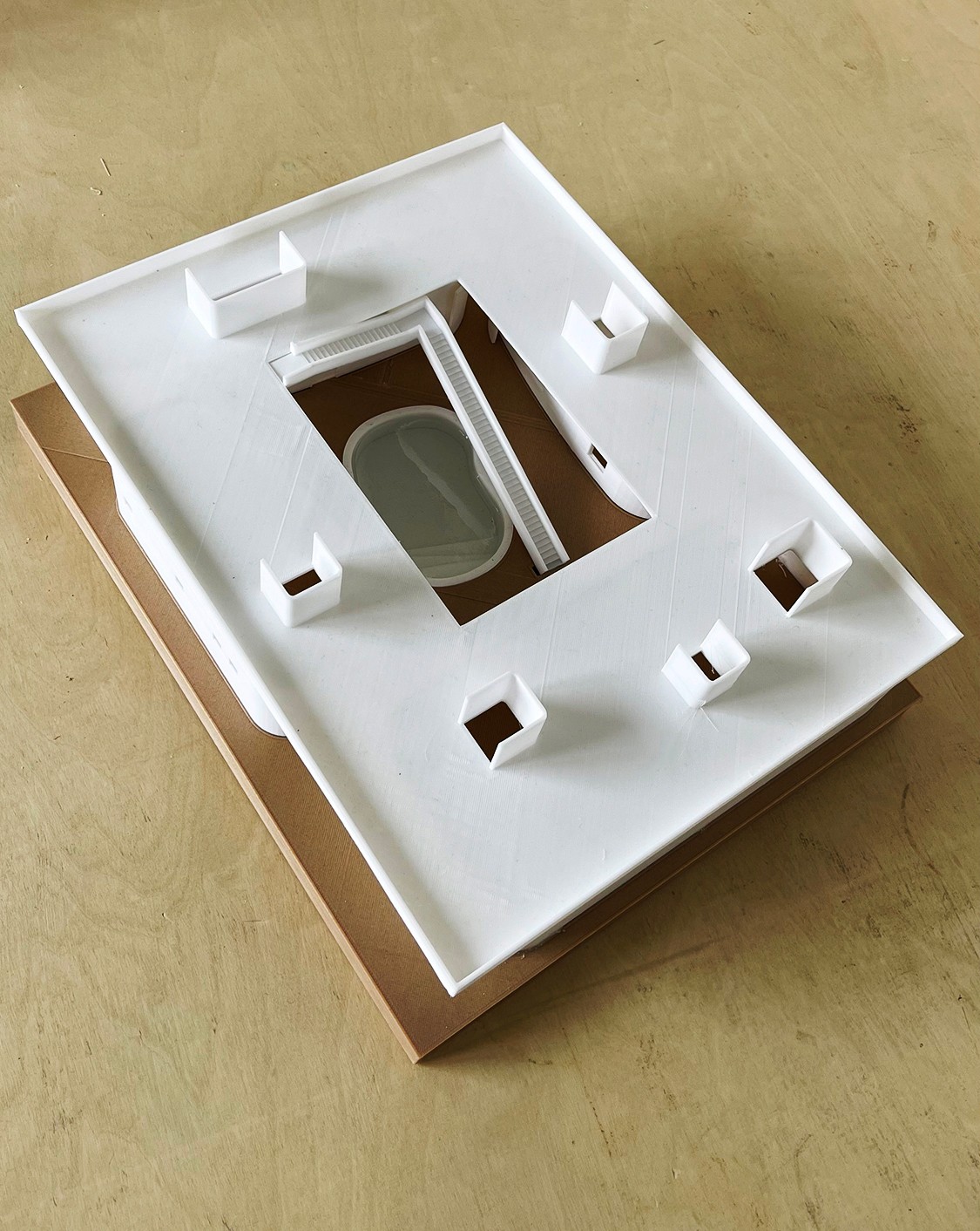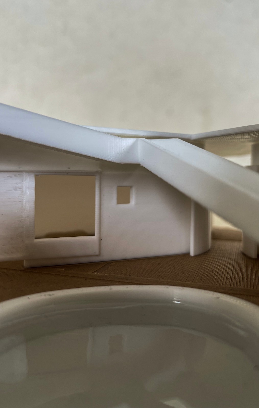 院中泳池边上是连接院子与屋顶的长梯,泳池的四分之一在长梯之下,二者形成了对话关系,人们走上长梯路过泳池到达屋顶,过程中速度可快可慢。