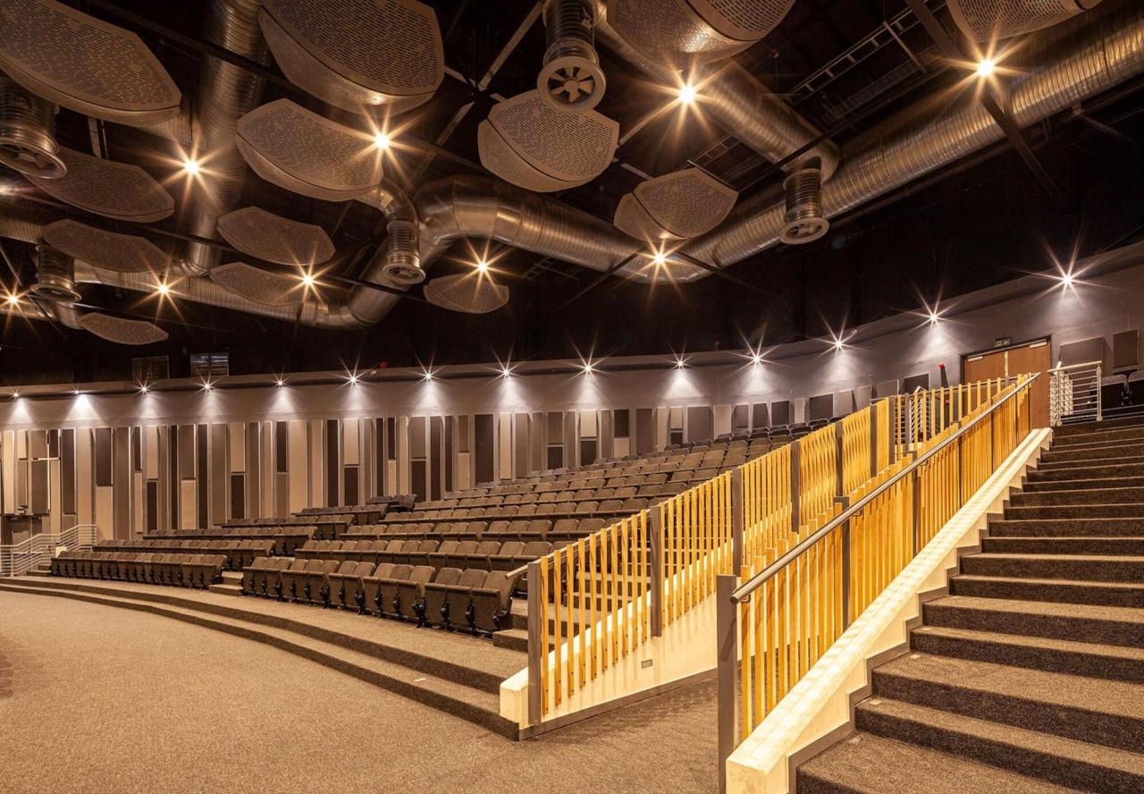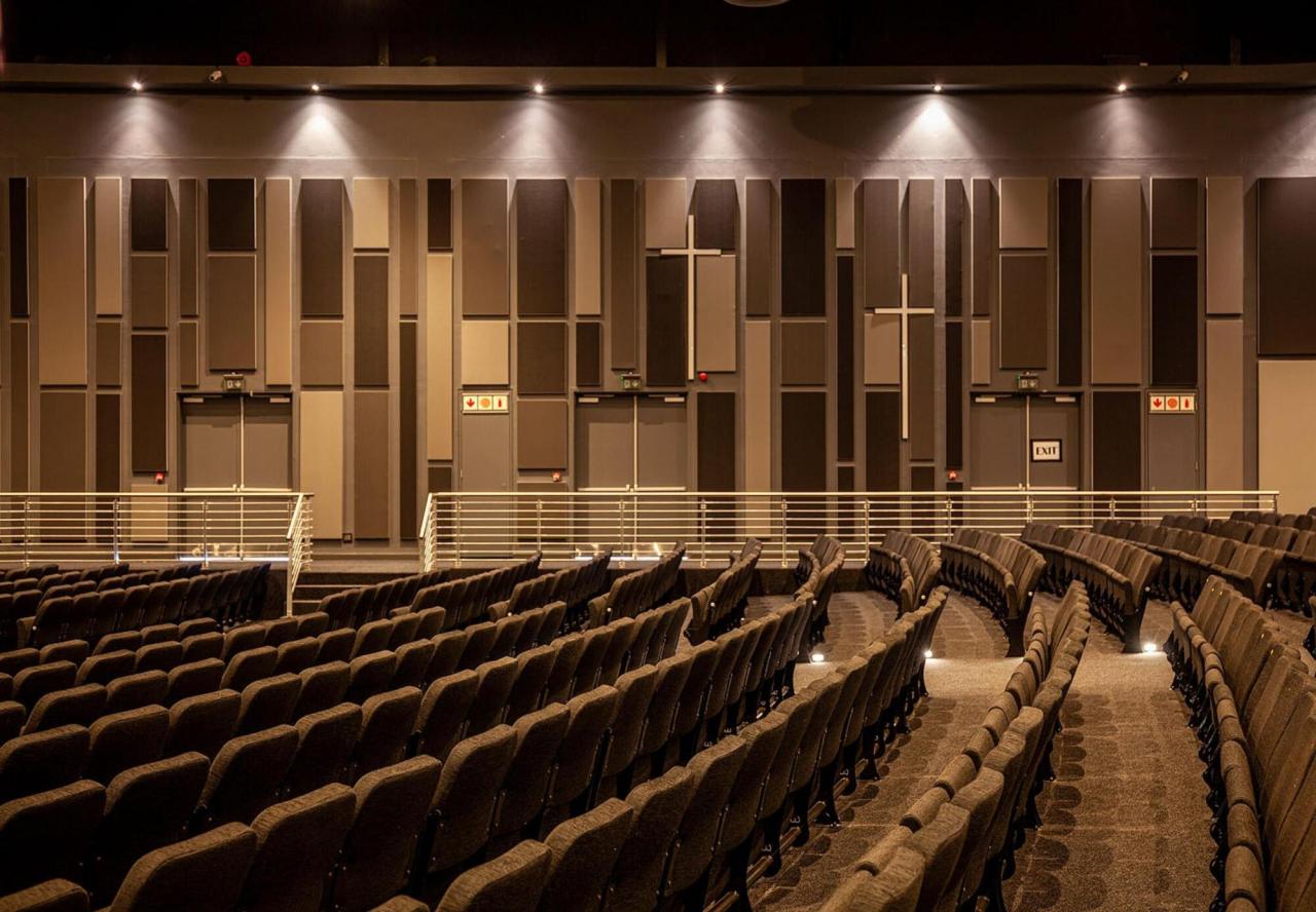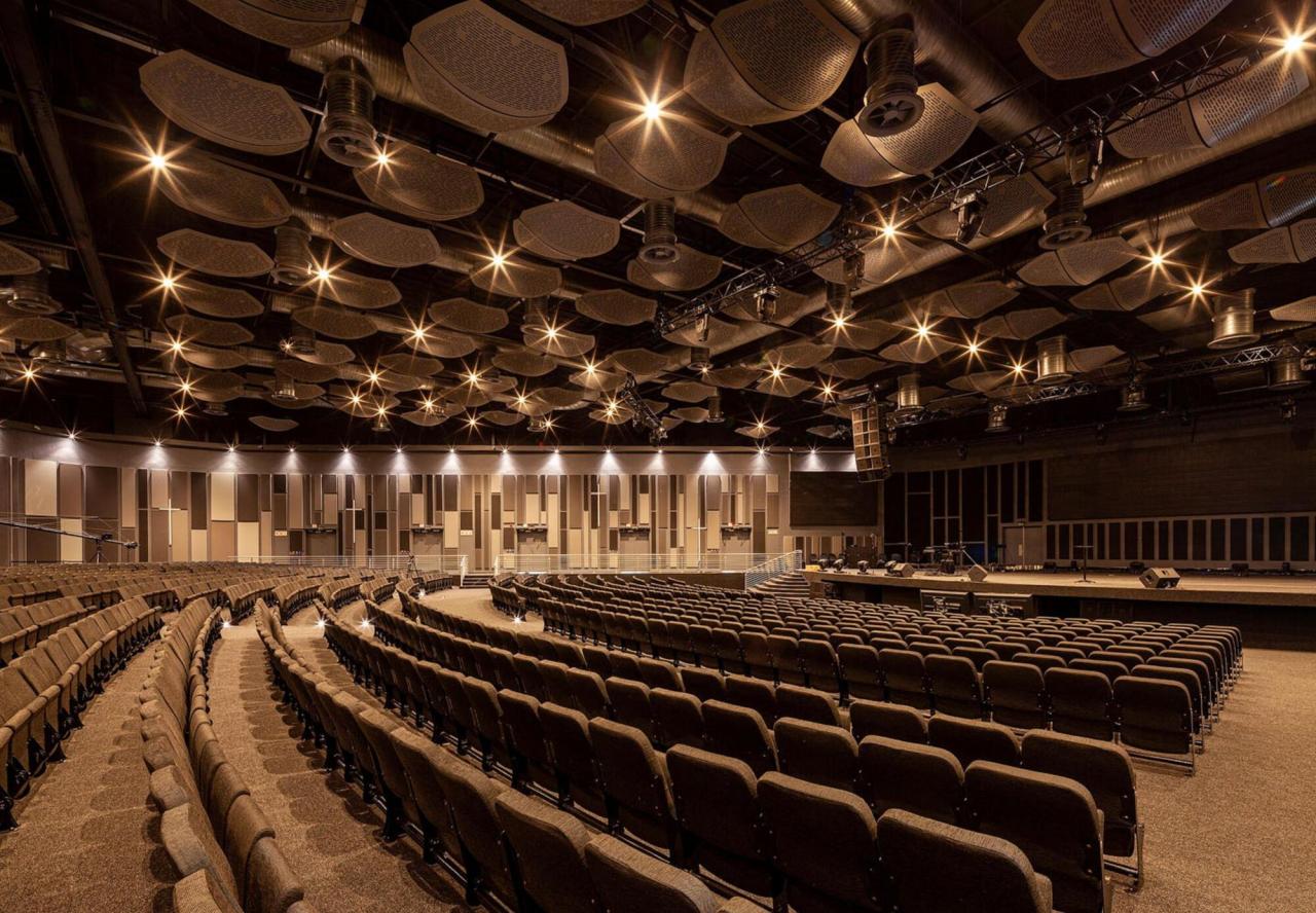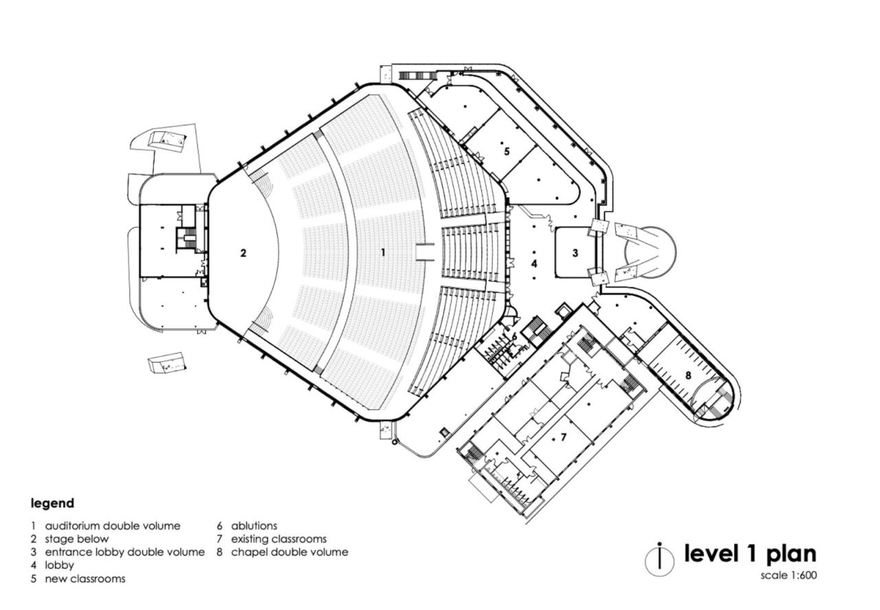 建筑师进行了广泛的建筑学和工程研究,以在 3500 个座位的礼堂上方实现一个经济的、带有三个连接拱圈的大跨度屋顶;拱圈实则为一个球体结构的“裂片”,也就是将一个外壳悬挂于具备声学规划的礼堂上空。该解决方案同时实现了设计需求的两个主要目标:标志性的“虚拟穹顶”和具有出色声学特性的教堂空间。礼堂是整个项目的核心空间,被入口、门厅、小礼拜堂、上层教学空间、表演空间和技术服务设备间所围绕。