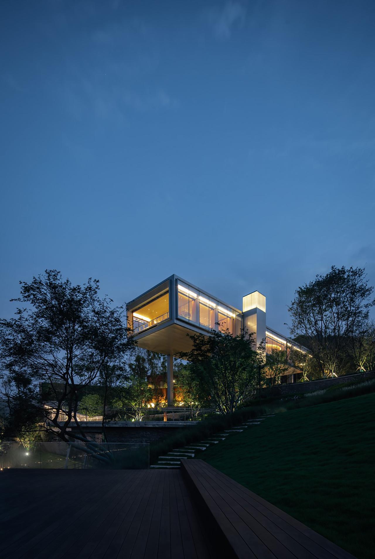 建筑风格上,建筑师并不拘泥于某种风格化或者可阅读的符号,重在表达清晰的建造逻辑,还有通过设计手法对空间、对场景的情感呈现。依托于场地的竖向,建筑悬挑于湖面一侧,框的元素与景观产生很好的对话关系,精致的铝板及玻璃材料与自然风貌之间的野趣又产生戏剧性的对立和矛盾,极具雕塑感的形态予以场域一种力量和超现实之感。