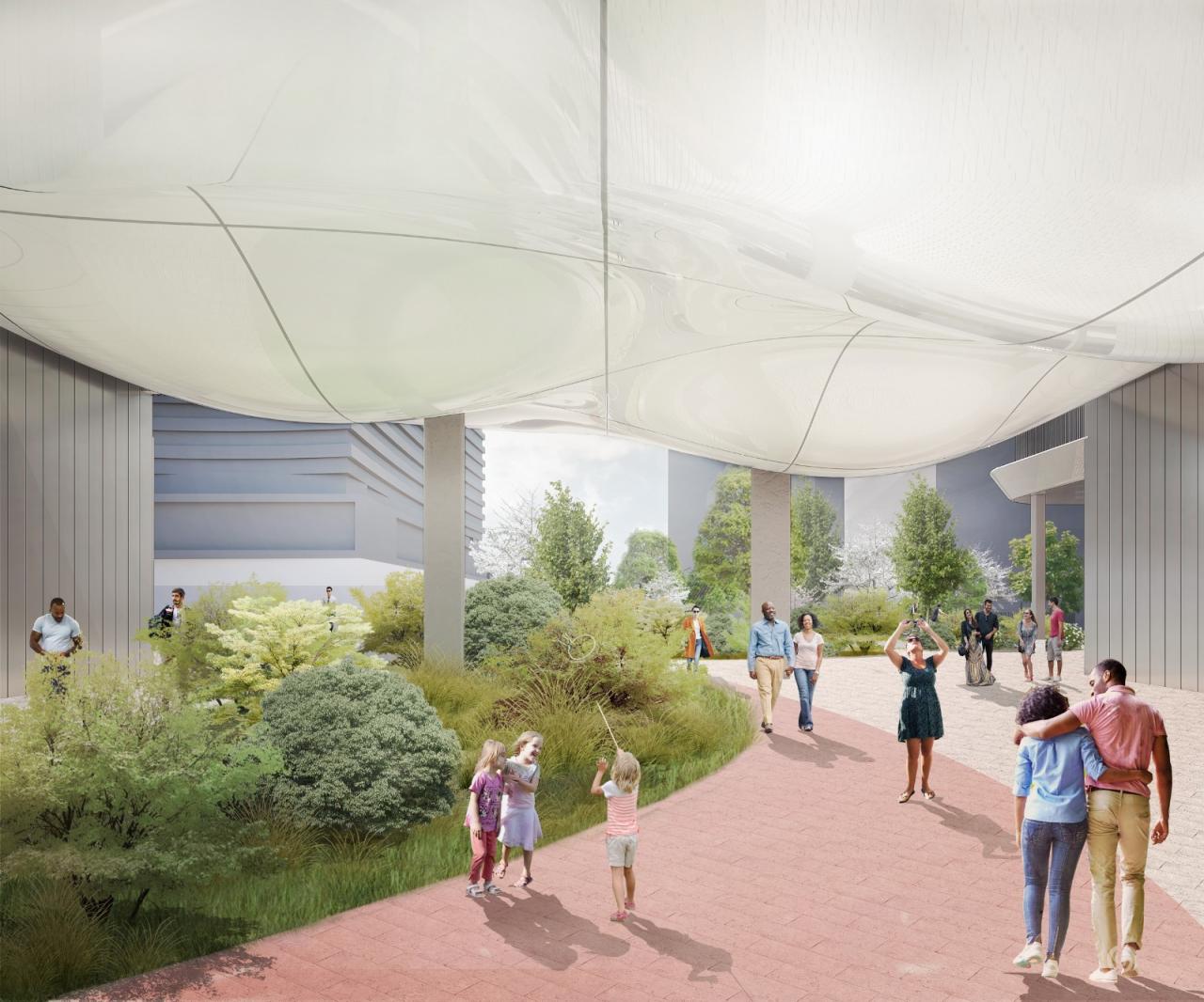 首层中庭贯穿建筑东西,被设计成灵动的城市公共空间,可举办小型公共活动,如户外展览、户外宣讲分享会等。中庭屋顶是呈浮云状的雕塑,连绵起伏,模糊了人工与自然的边界。