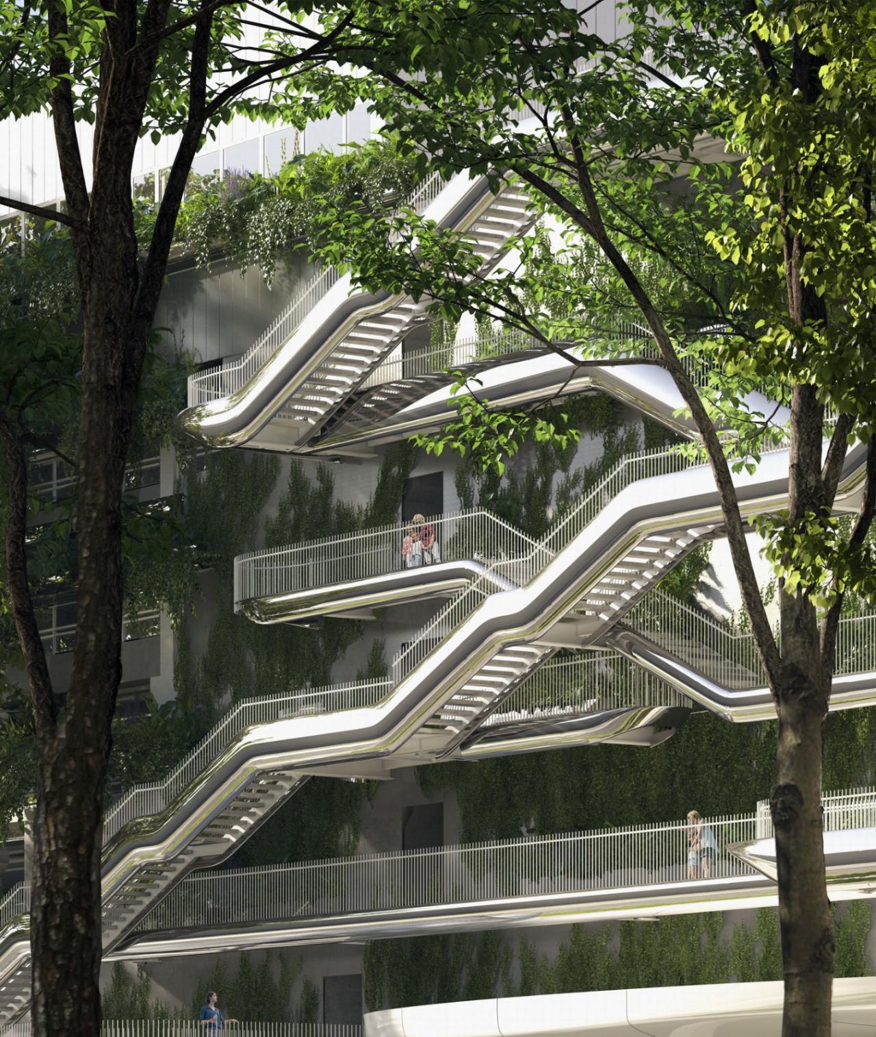 建筑长170米,宽50米,高28.5米,地上七层,地下一层。当人们进入MIND园区西侧时,首先映入眼帘的是MoLo满眼青绿、充满跃动感的建筑立面。停车场所处的地上5个楼层外立面布满了绿植,巧妙地以自然柔化了建筑的庞大体量,同时增添了园区与人们的亲近感。平时作为功能被低调隐蔽在建筑内部的楼梯,在MAD的设计中反客为主:由抛光金属制成的之字形楼梯充满了雕塑感,相互交错并向上延展,成就了建筑的动感气质。