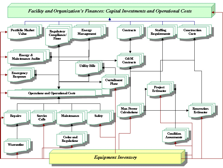 设备库存或设施设备清单构成了许多设施管理活动的基础。设备清单用于设备状态评估、能源管理、应急响应、保修、人力计算等。下面的图1对此进行了说明。操作和维护会因设备库存不准确或缺乏而增加时间、人力和成本。未能正确跟踪设备库存会降低项目范围和成本估算的可靠性,影响应急响应速度,并降低执行决策的能力。