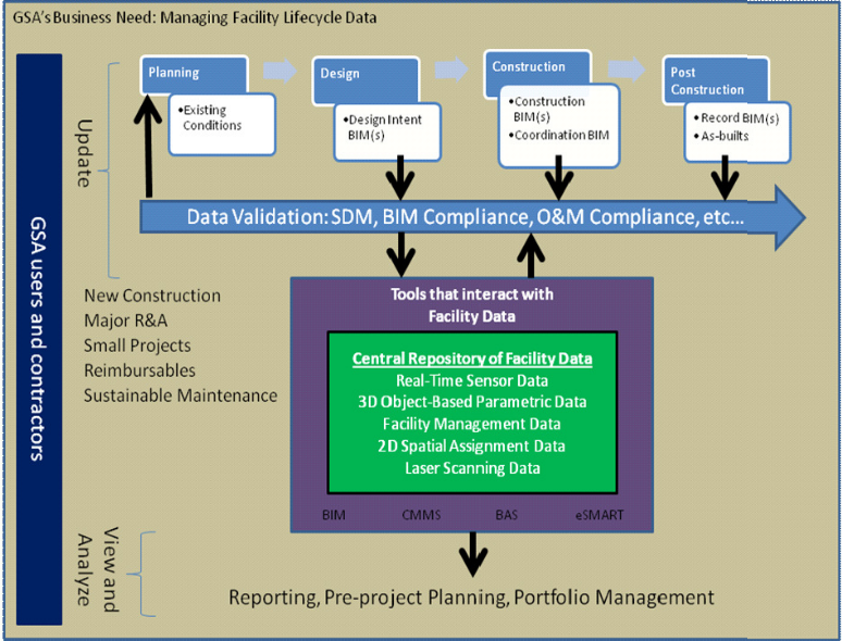 GSA的愿景是简化BIM在整个设施生命周期(从规划到运营)中支持BIM-FM集成的使用方式。GSA负责联邦政府房地产及其相关资产,比如图纸和设备信息。中央设施存储将是管理设施信息的关键组成部分。中央设施存储库计划集成并容纳3D对象参数化数据、MEP系统布局、资产管理数据、设施管理数据、建筑材料和规格、2D数据、激光扫描数据以及实时传感器数据和控件。通过中央设施存储库,使BIM技术可以为所有类型的项目包括新建项目、重大翻新/研发项目、小型项目直到运维阶段进行项目管理和后期维护。此外,运维人员将可以查看BIM模型。软件工具将“位于”中央设施存储库的顶部,以提供安全性、搜索和查看功能、版本控制、更新通知以及分析和报告。