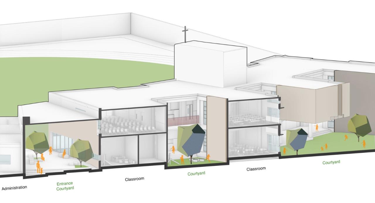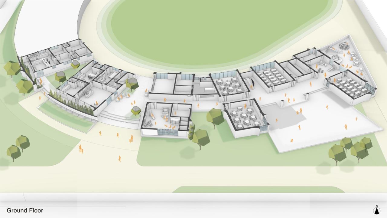 大多数开口都朝向建筑内部的小庭院,它们由手指状建筑体量的空隙组成。这些庭院几乎都没有向着风吹进的方向开口,它们在白天互相遮荫。球场被隐藏在内部,为年幼的孩子提供私密的玩耍空间,也可能在冬季作为教室使用。