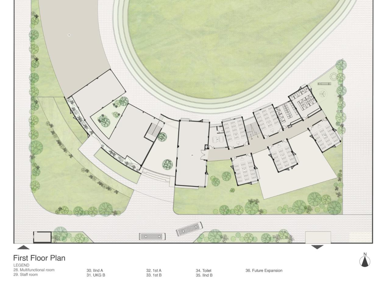 这所学校位于其中一块居住集群的郊区田野之间,随着稻谷收成,在夏季我们可以享受优美的风景和凉爽的风。但在收获周期结束时,频繁的沙尘暴便会袭来。由于燃烧秸秆,强风会带来大量灰烬。这些因素最终决定了学校的形态逐渐演变为弧形。堡垒般的墙壁通过扭曲偏转引导风顺着其表面穿过建筑体的开敞口袋,形成更加温和的气流。