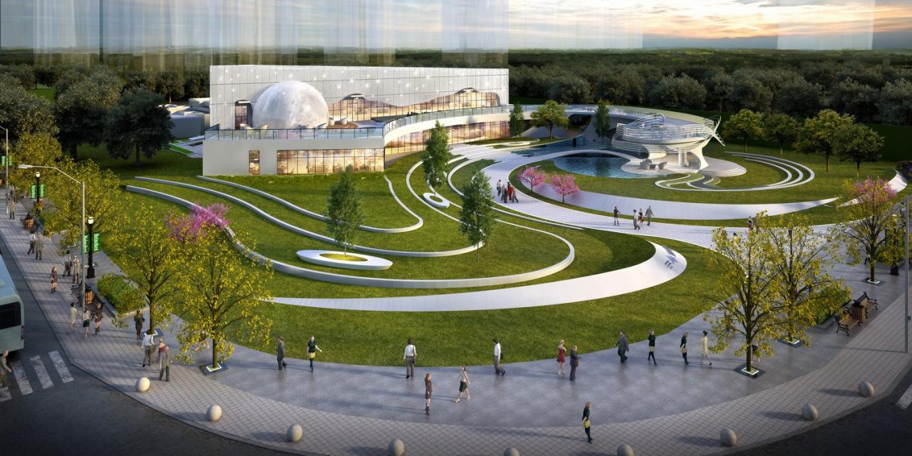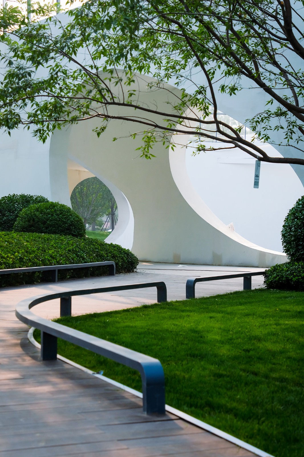 建成后的体验中心不仅服务于购房客户,也是未来市民休闲活动的场所。外部空间设计上,穿过长廊,回转,进入中心广场,豁然开朗。人们的各种交流活动融入景观之中,惬意又随性。