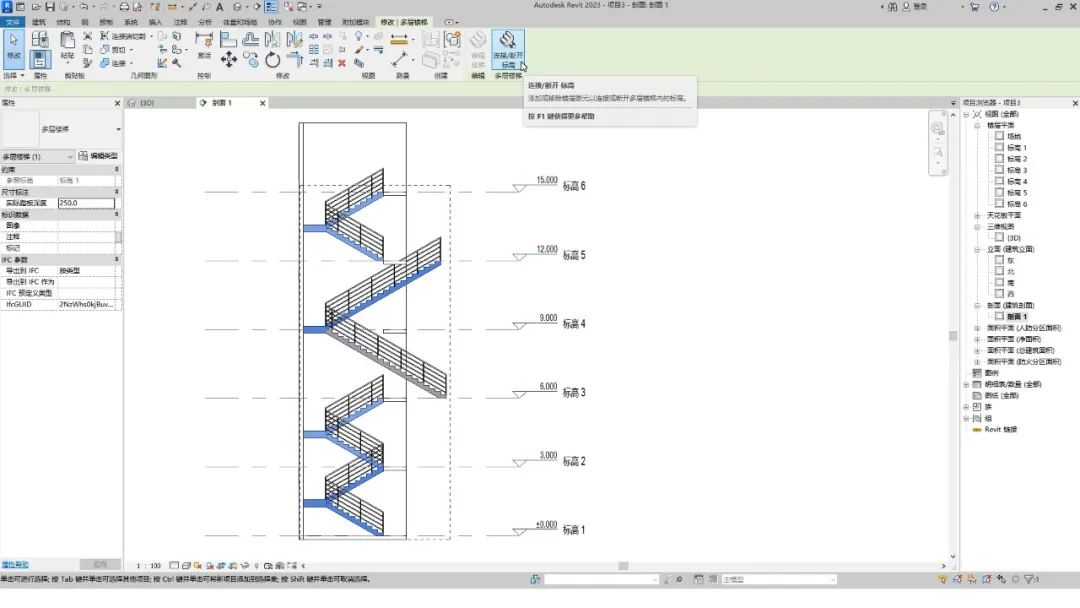 也可以再次选中楼梯,点击修改面板中的连接或/标高按钮。