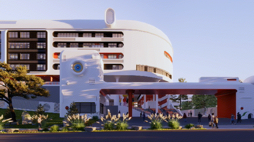 我们将"未来校园"转变为一个外星球的基地,这种意识形态更能促进学生的好奇心与创造力,整体的建筑造型从外部看去,更像一座停留在山野之间的太空基地,充满未来与想象。