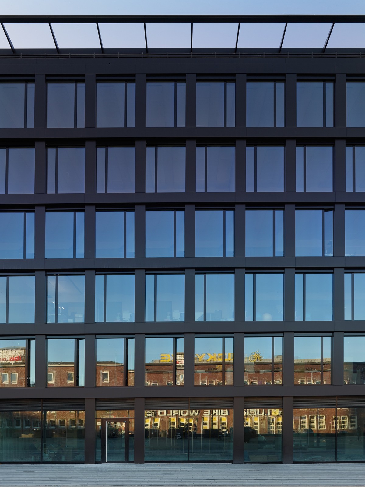 墨卡托一号的立面使用了由 Wicona 制造的 90%再生铝 Hydro CIRCAL。这一再生材料中的铝来自于先前的已拆除项目、汽车或食品包装,因此这一材料的制作、使用也可以被视为德国市场上具有开拓性的旗舰项目。此外,出于对隔热、隔音的考量,建筑安装了三重隔热太阳能控制玻璃,由此让立面玻璃板块也成为了遮阳的设施。同时,设有集成式照明的前沿天花板系统集结了供暖、制冷、换气、以及优化的声学效果等功能,由此让整体建筑有着超过 80%的热回收率。