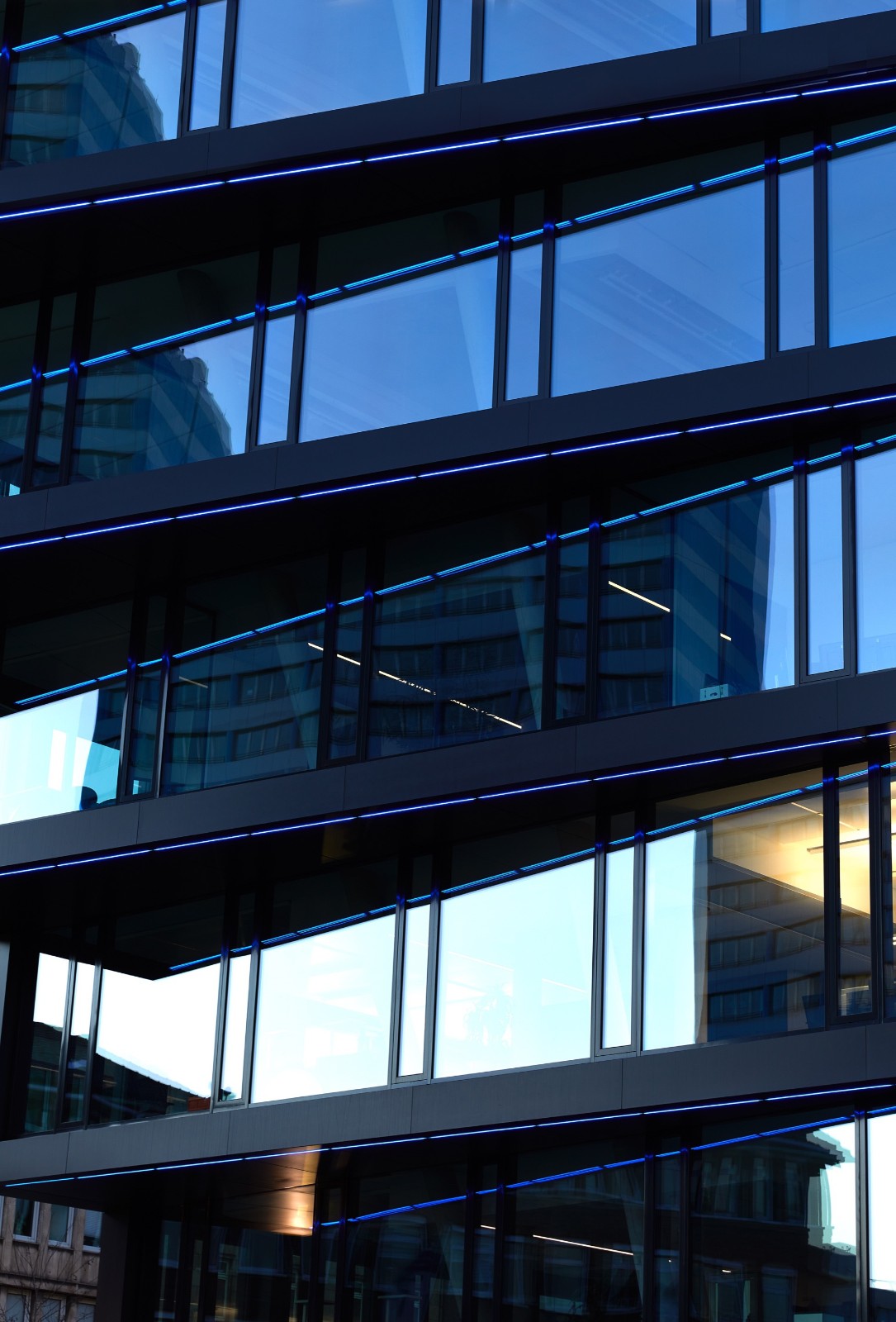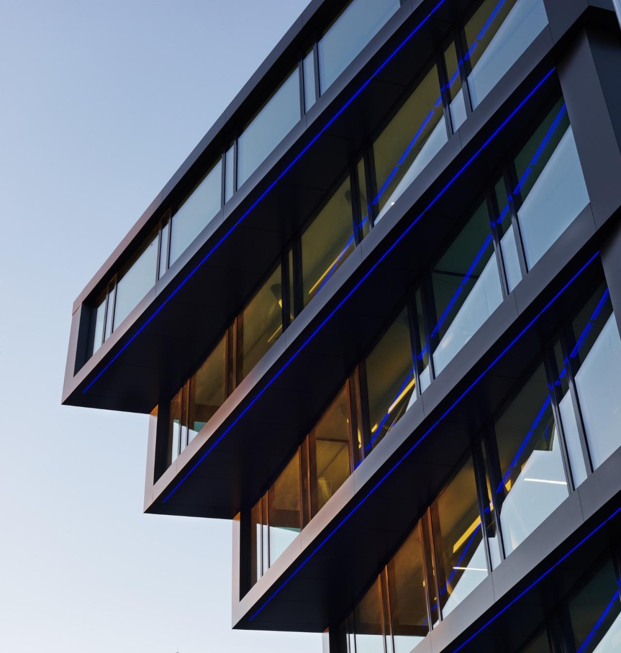 虽然墨卡托一号办公楼的立面采用了哑光金属“无烟煤色”,但是其建筑外观仍旧引人注目,并展示着一种相对保守的特征。此外,这一办公楼大面积的玻璃幕墙增加了体块的透明度及轻盈感。并且,楼梯间与建筑核心筒结合,以此保有以矩形网格为图案理性划分的清晰、独立立面。