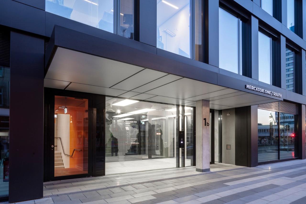 墨卡托一号如入口大厅、侯梯厅、楼梯间等公众可达室内空间皆符合德国最大都市区“鲁尔河畔(Ruhr)”“粗与犷”的信条,此外建筑还使用了如混凝土、钢材、玻璃、石材、木材及油漆等纯粹、直接、过时时也不失优雅的材料。