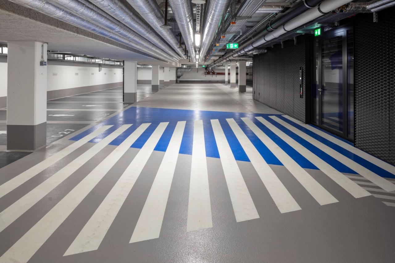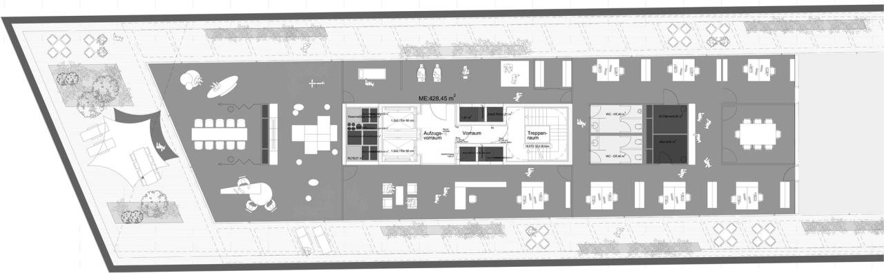 建筑一层设有 1200 平方米的高层高空间,以此用于餐饮或零售功能。餐厅和咖啡厅架构还将为建筑边全新设计的朴茨茅斯广场(Portsmouthplatz plaza)提供舒适的座位,并激活室内外公共通道空间,由此形成连接火车站及杜伊斯堡“市中心”的城市核心焦点。此外,这一办公大楼的实用性还体现在地下空间,这一大区域设有 2 层地下停车场、约 130 个停车位、以及建筑服务设施和仓储区域。