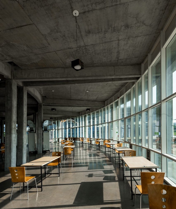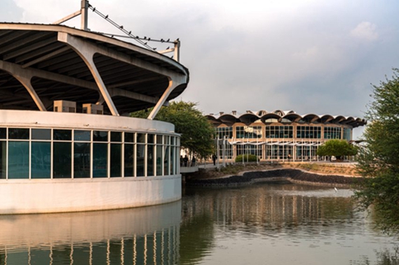 人行道是由一个风筝形顶盖遮蔽穿过湖的对面,那里有圆形结构的餐厅和娱乐区,以及钢框架制造设施。这个建筑的设计,重量轻的功能空间与混凝土框架的功能区形成对比。
