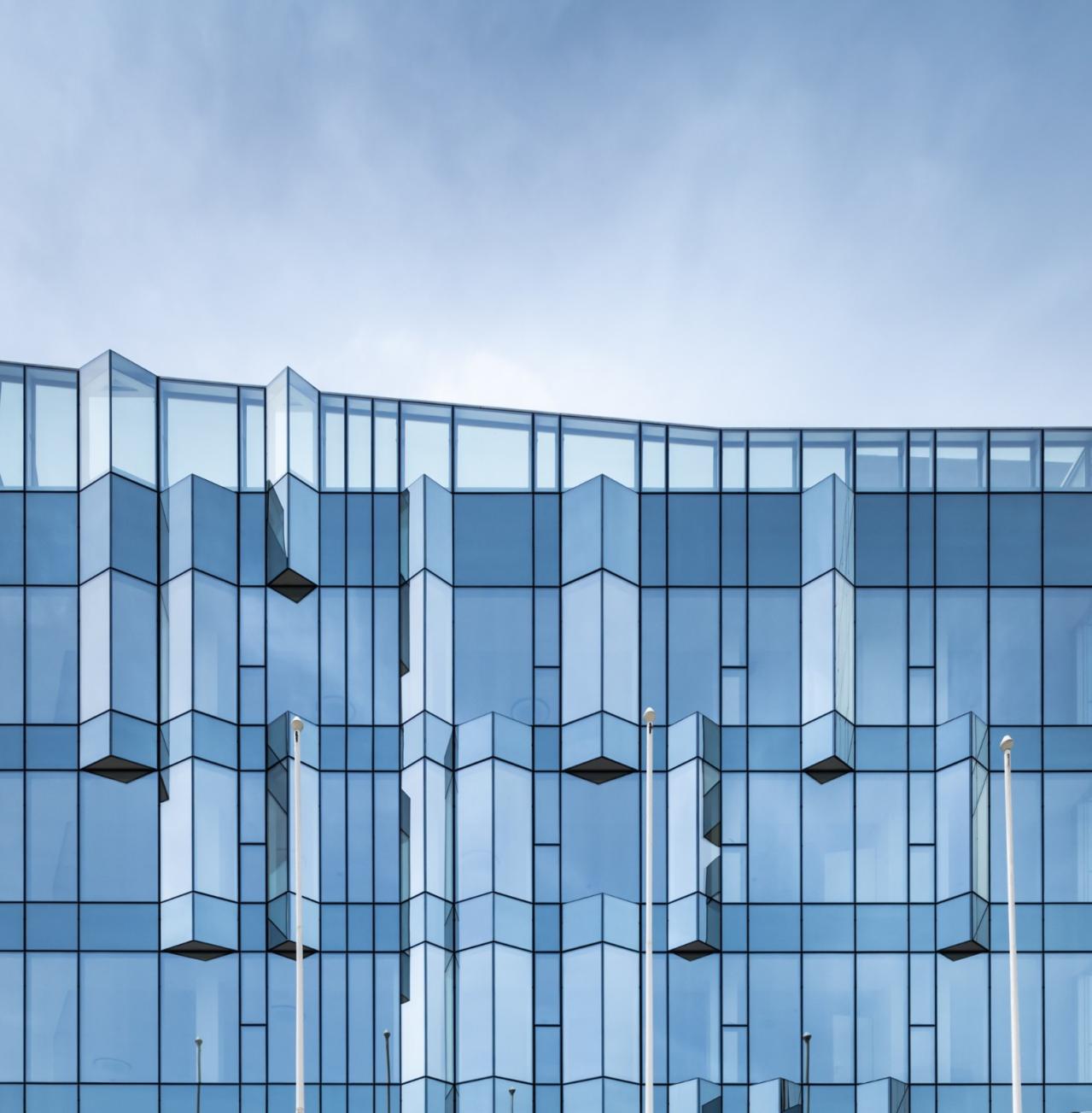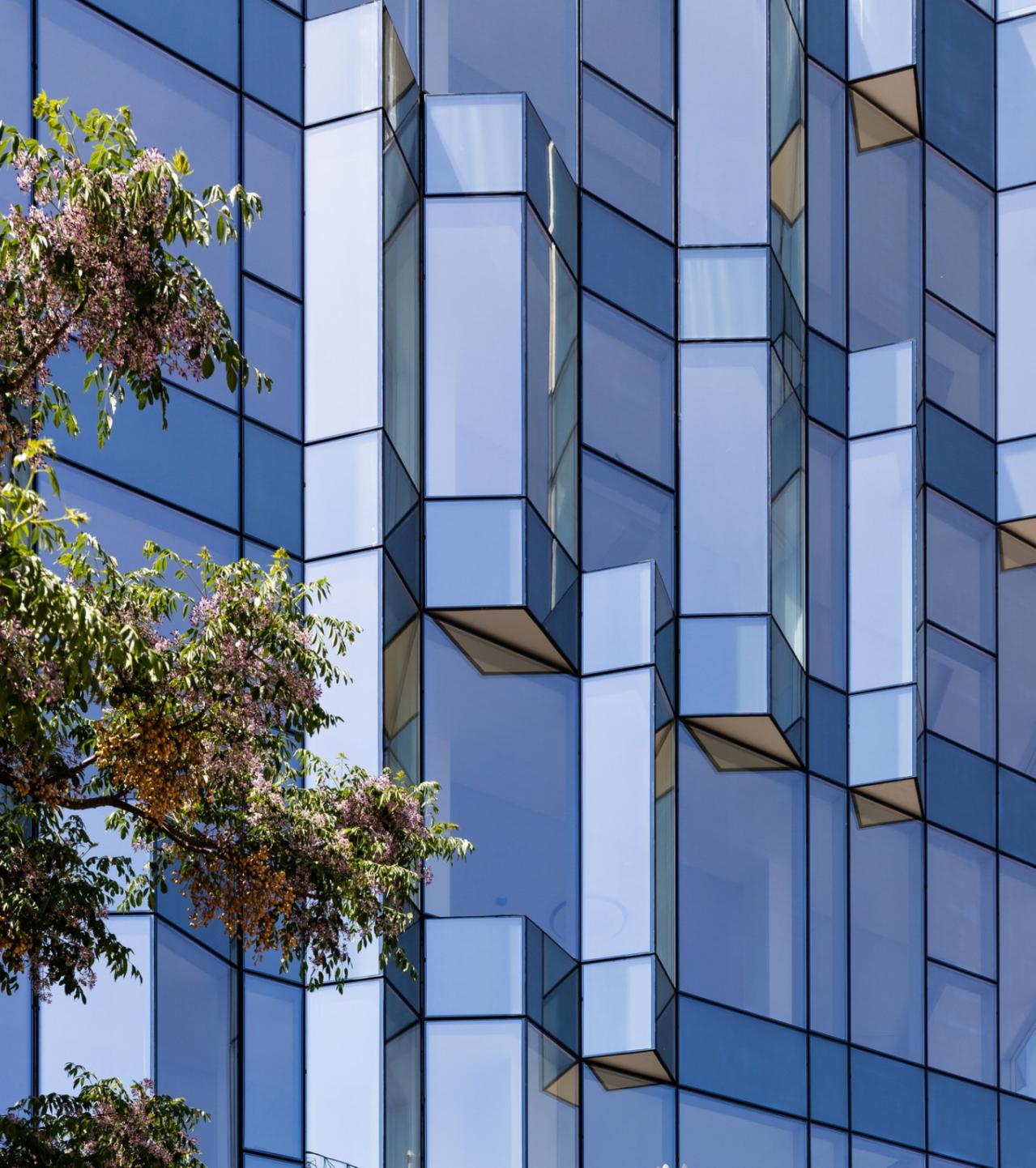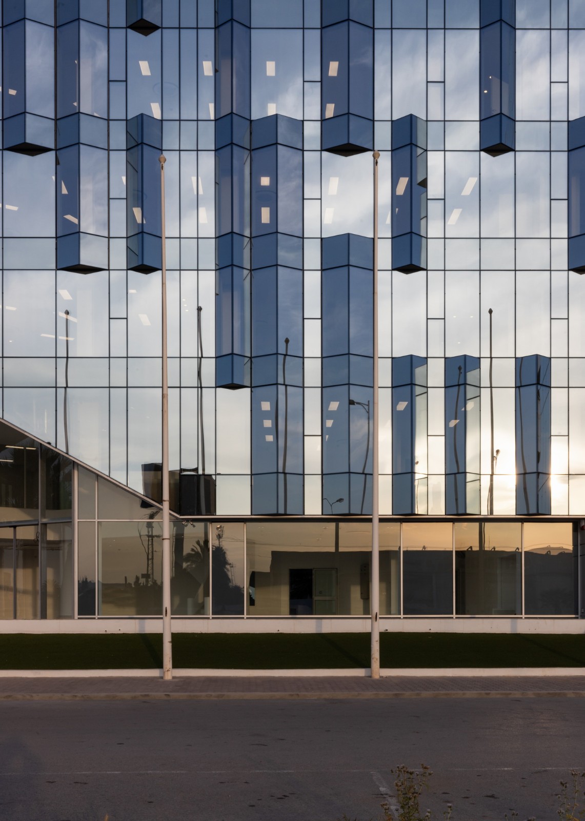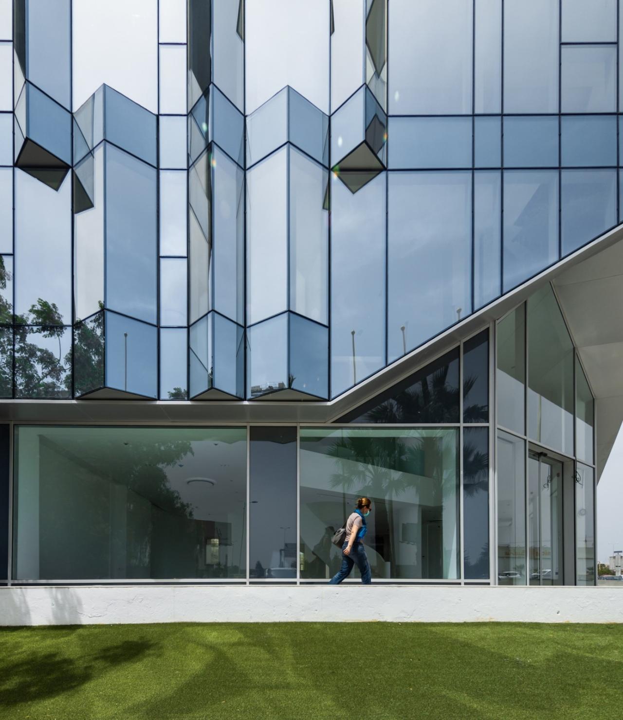 乍一看,ETRATON 的表皮确实是一个具有高太阳能和热能性能的玻璃面纱,它的规格赋予了整个建筑一种独特的活力。玻璃板的选择是经过了完整且彻底的研究过程的,研究重点是技术、效率和美学,以保证能获得一个中性的、无色的和高反射的结果。两种类型的棱镜在不同的高度上点缀了外墙。这种与所选材料的主要特征相关的体积的微妙变化组成了一个有趣的反射和阴影的表面,展示了该建筑对日光和周围环境色调的高度敏感性。