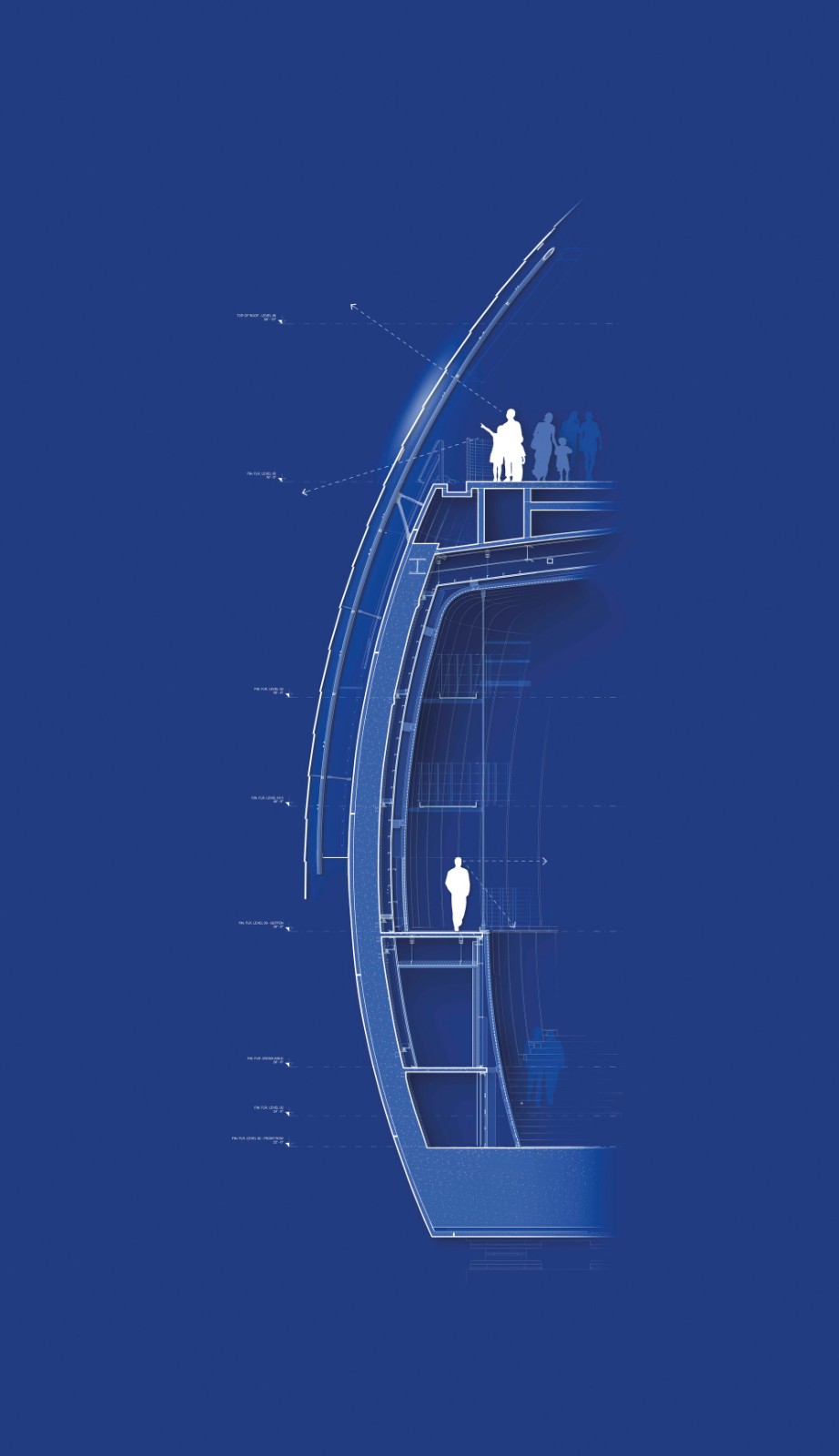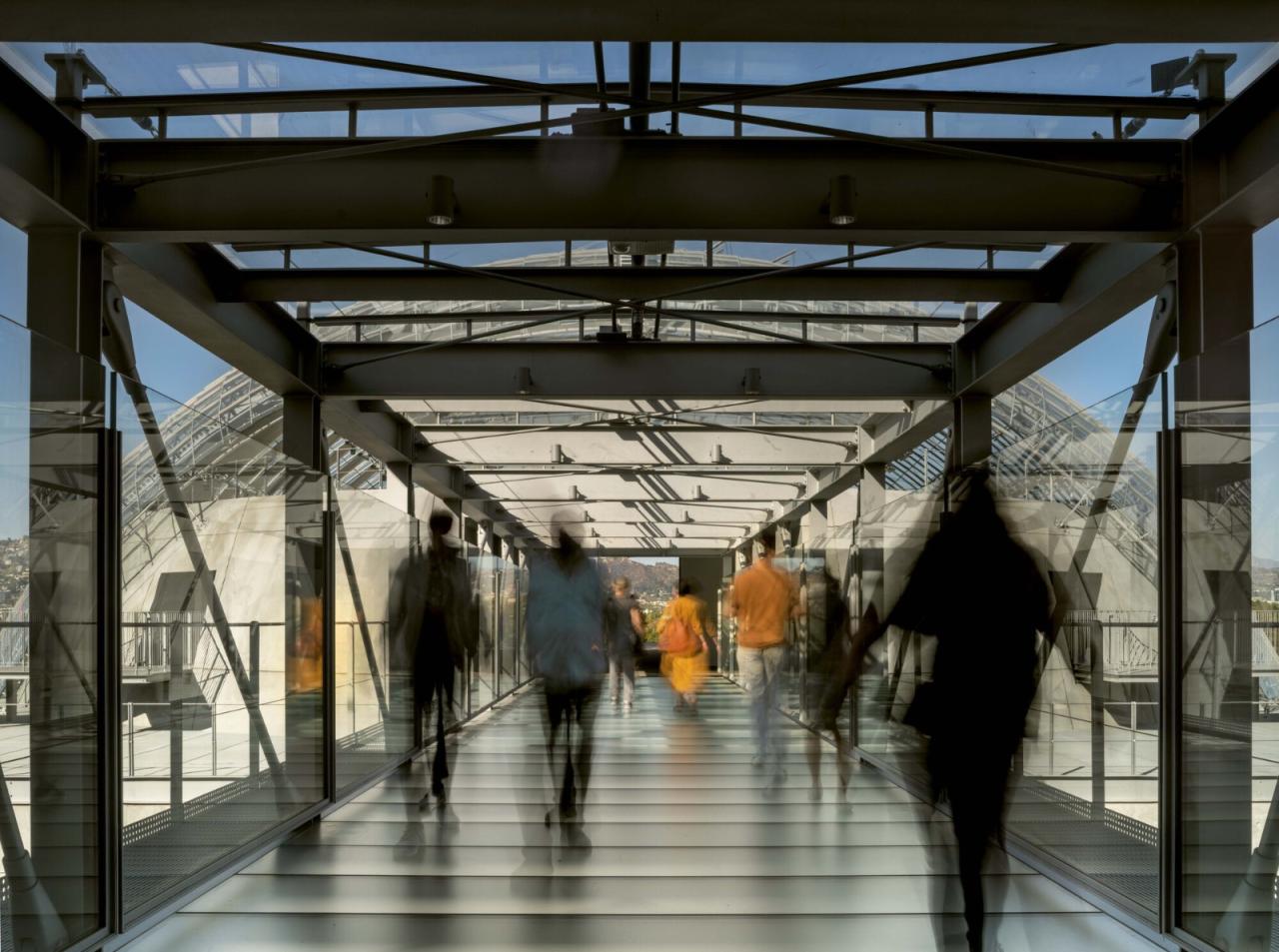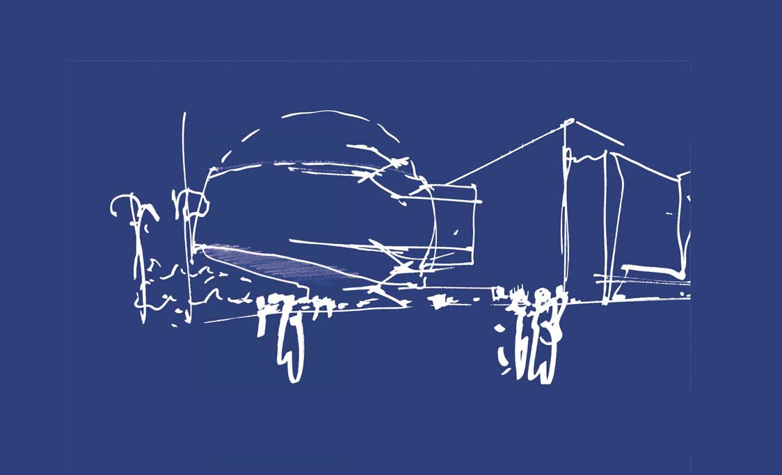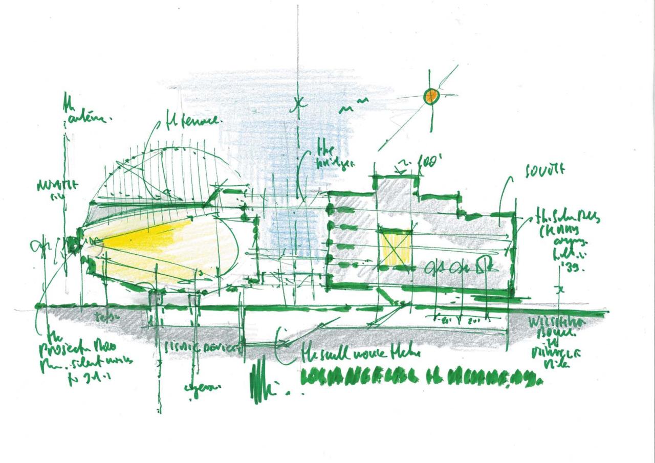 “新的球体结构,其建筑形式似乎可以脱离地面,进入永久的、想象中的空间和时间的旅行,这就是观影。通过连接这两种体验,我们创造了一种存在本身就像电影的东西。从一个序列到另一个序列,从展览馆到电影院和露台,一切都被融合成一种体验。”
