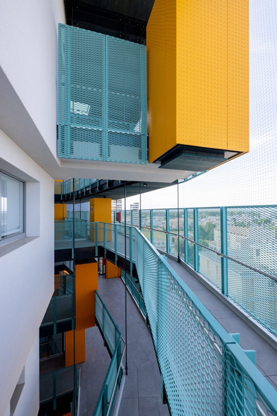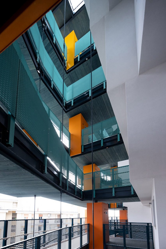 在面向城市的北侧,一系列色彩鲜艳的走道提供了沿楼层和楼层之间的通道,旁边还有一个单独的包含电梯的空间。这些栏杆的蓝色网格由附近威尼斯环礁湖使用的渔网构成,而公寓的亮橙色入口楼设计成类似浮标。ElasticoFarm 工作室说:“这座悬挂式建筑采用弧形的形式,将公寓组织起来,这样,再向上移动时,它们就有了大型露台和面向大海的开阔视野。”它接着说:“在这样做的过程中,每个单元都充分利用了自己的位置,”