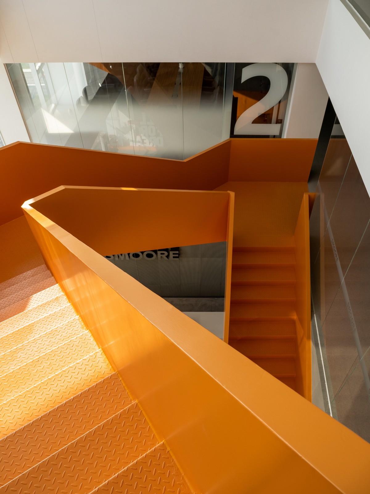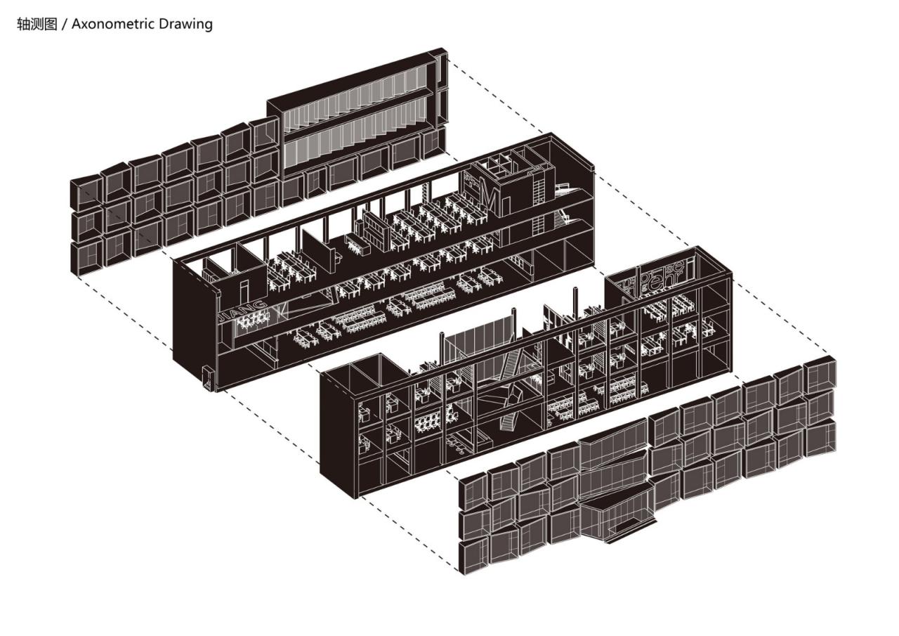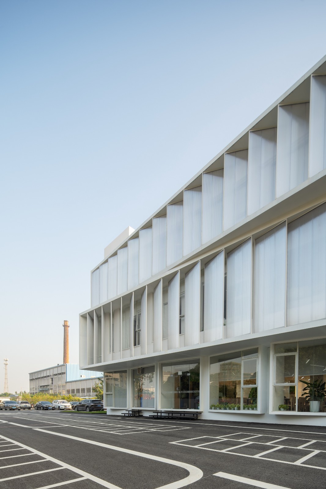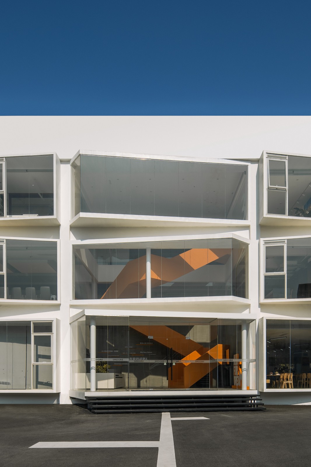 行政楼在改造中被置入更多现代化的使用空间,内部功能一层为员工食堂,二三层为开敞办公、会议、休闲接待等。建筑主入口由北侧被移至面朝广场的南侧,设计将原有的双分式楼梯间拆除打通,变成通高门厅,再退让前台空间重建更轻盈的钢构三角形折跑梯,楼梯表面喷涂橙色氟碳漆,增强空间的活力属性。立面拆除山墙以外的外墙围护构件,用通透纯净的外窗单元填充框架结构,解决室内采光;窗单元出挑并呈现有规律的倾斜、错动,尺度也被较为严格地控制,构建出外立面的基础秩序。出挑使得整个外立面获得了一定的空间厚度,用来放置家具或盆栽植物等,留给使用者去自由想象与发挥。同时,窗单元也继续向室内一侧延申,或作为主管办公卡位、或转变成公共休闲空间,强化建筑内外设计的延续性。原建筑北面,二、三层有一个较大的挑出造型,基于不减少使用面积,方案选择保留这个造型元素,并用半透的阳光板覆盖外立面,结合板块的旋转角度变化,营造横向伸展的立面关系、丰富立面的秩序,也隔绝了从外部直视内部卫生间与机电管井的视线。