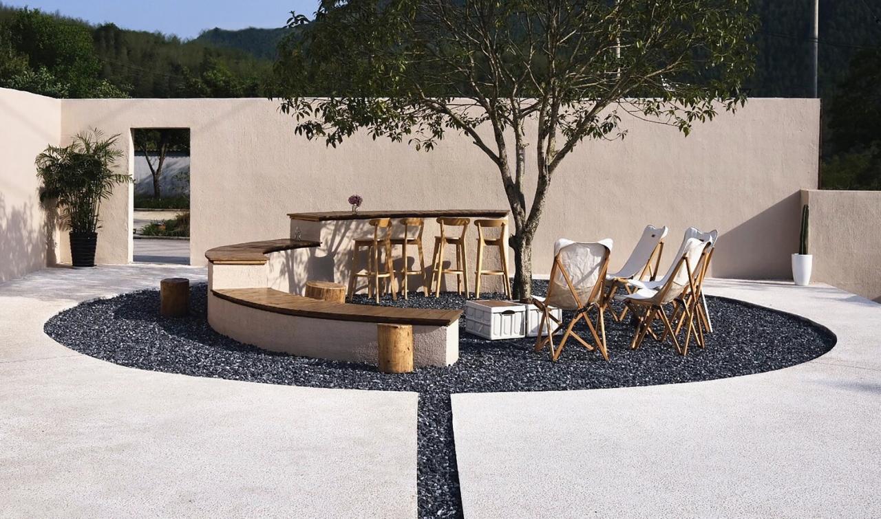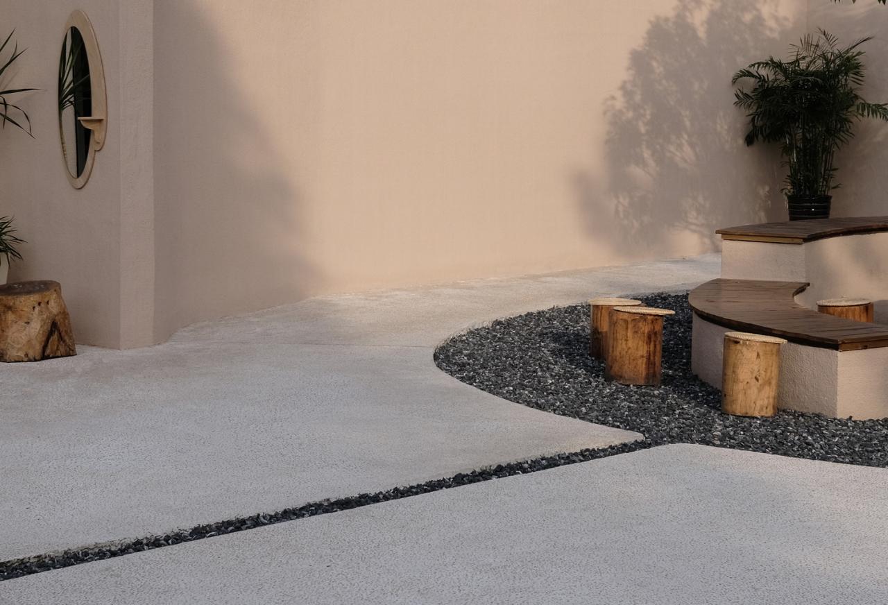 在材料的选择上,我们选用了水洗石,碎石,红砖等复古,自然的材料,以保证空间的经典和耐用。室外的涂料选择带有颜色的真石漆,在不同时段的光线下形成了微妙的色差,更有趣味。