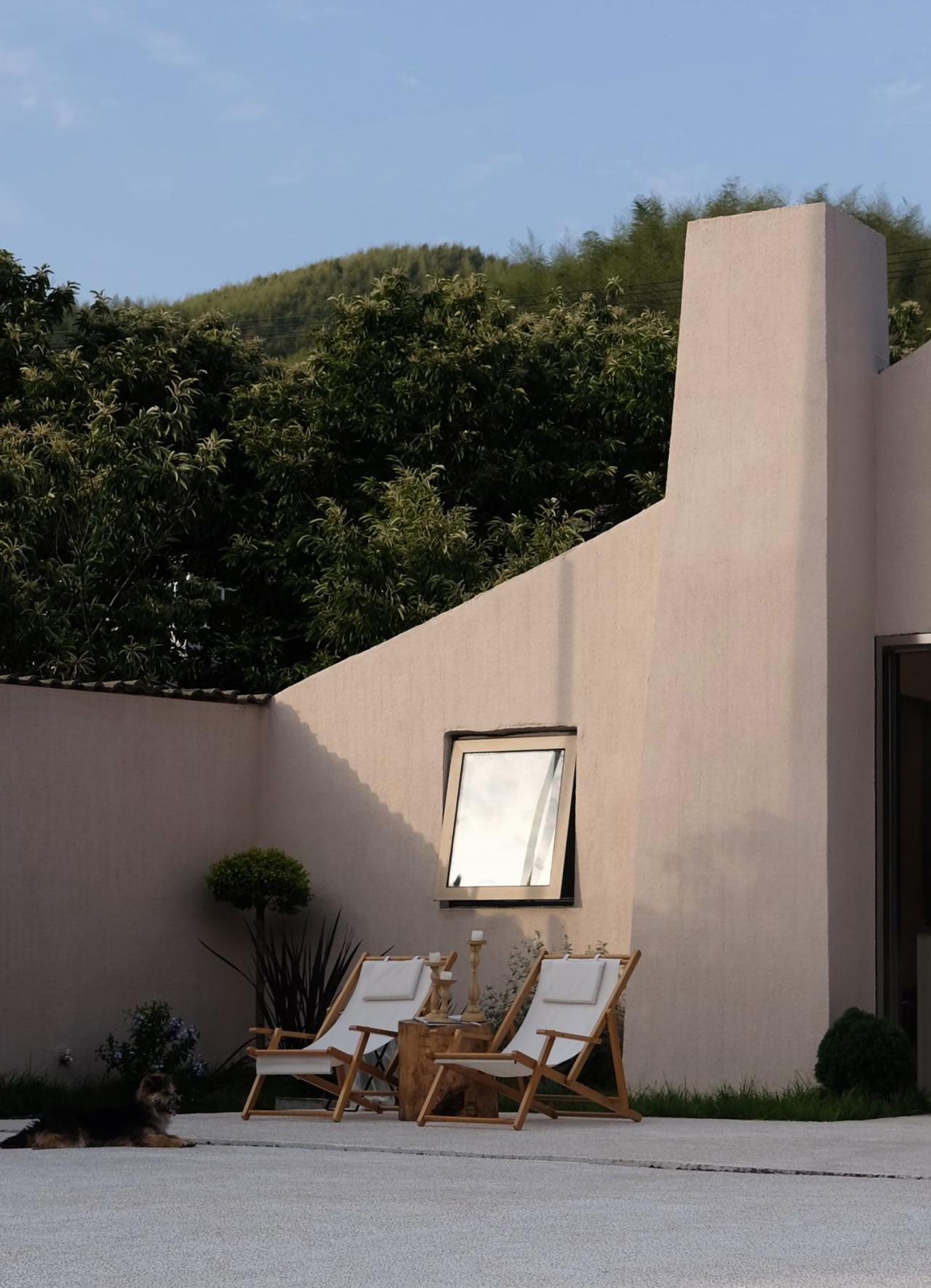 原本的外墙分为两部分,右侧仿徽派风格的车库与左侧后期加盖的斜坡屋顶仓库。两部分造型毫无关联,中间没有衔接。因此在建筑造型上,我们以乡村“烟囱”为意向,将雕塑感强烈的假烟囱造型植入在仓库与车库的立面交接处,并修剪仿徽派山墙面,将其恢复到传统民居的双坡屋顶的简洁造型。
