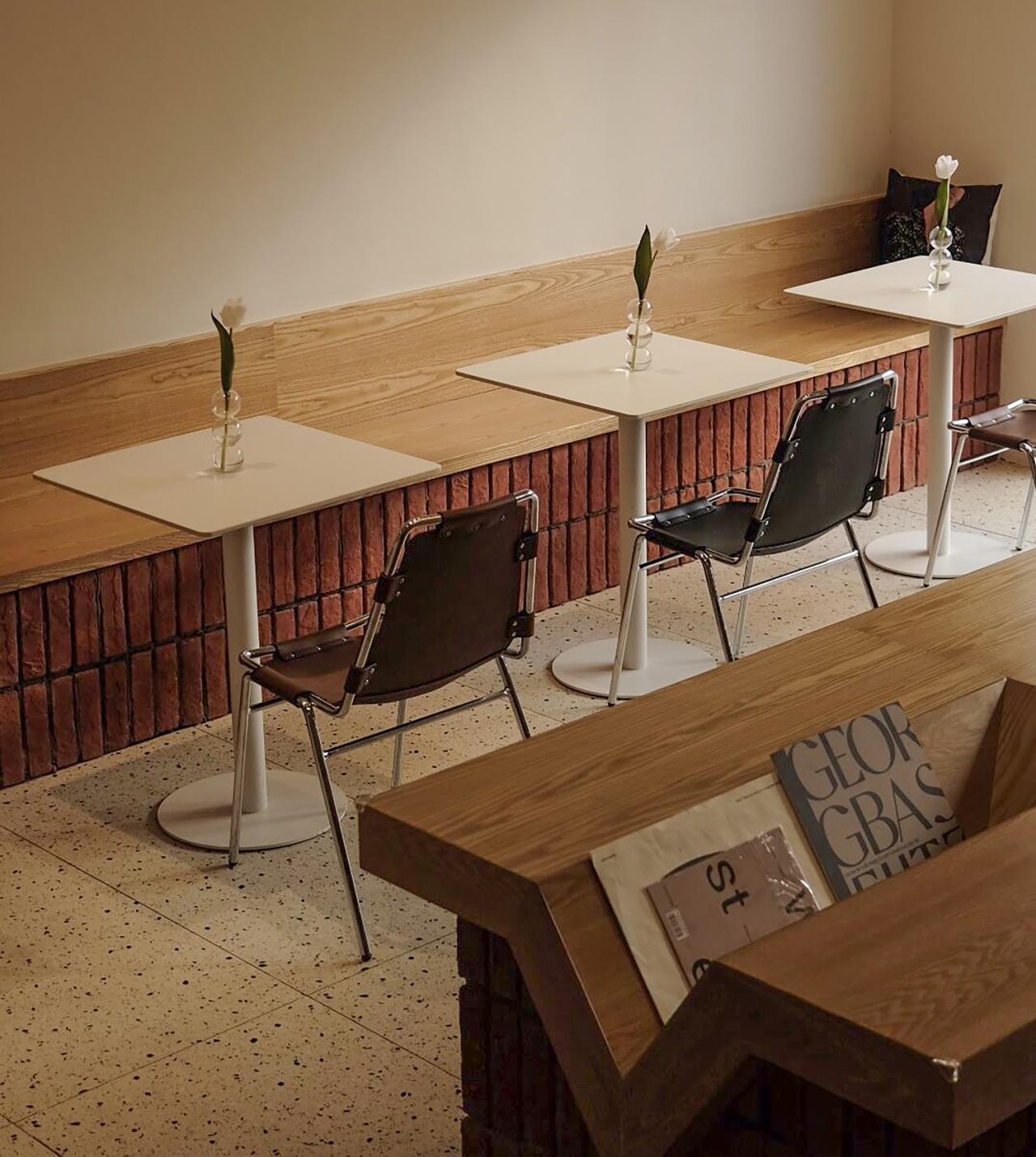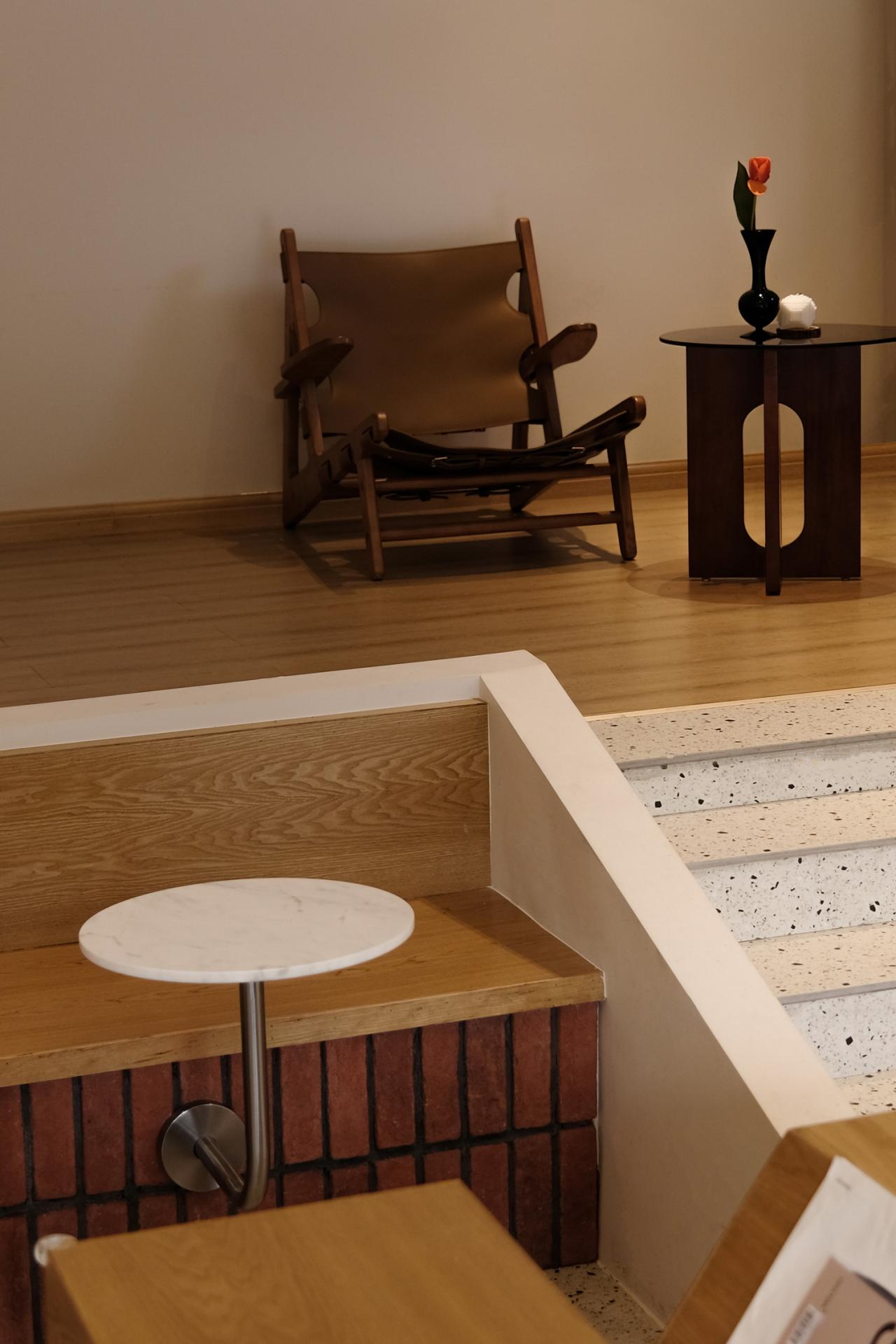 在室内设计方面,我们沿用了景观设计中楼梯的形式,对室内局部进行了抬高。在剖面上形成了不同层次的座位,自动形成了卡座区与散座区两个区域。这样从门外玻璃也可以对室内的造型一览无余。