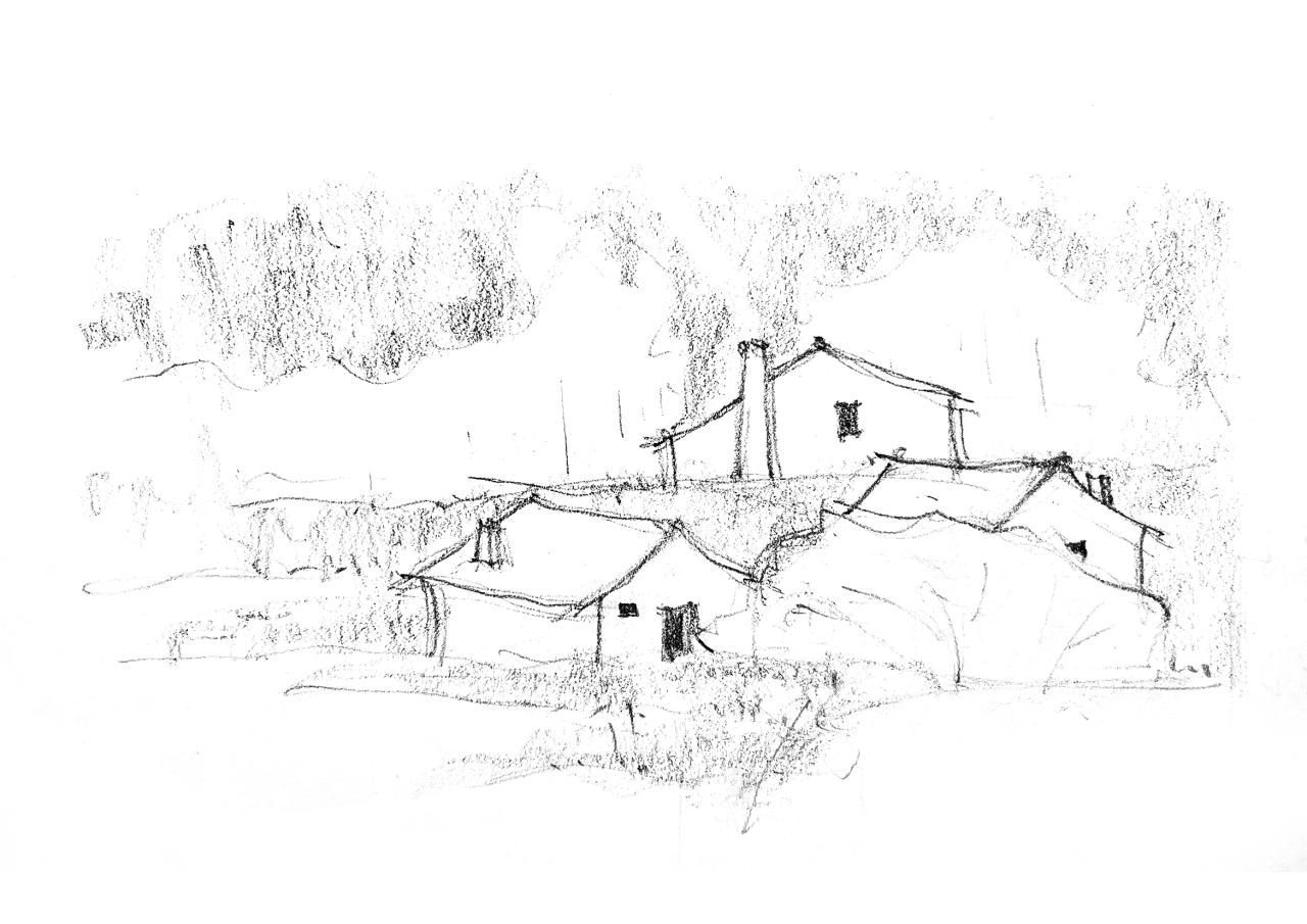 我们由村中老房子的烟囱受到启发,烟囱是乡村建筑的特色,是城市建筑所不具备的结构。以烟囱为意向,可以唤起人们对田园牧歌生活的联想。一个带有抽象烟囱元素的主体,正是对乡村原始生活的映射和幻想。