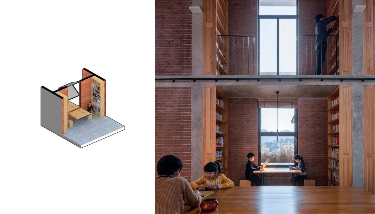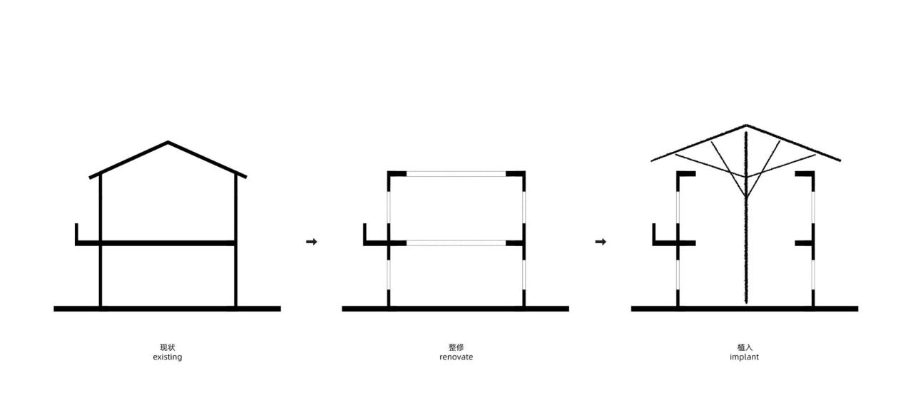 原有建筑整体呈现L形布局,由两层主楼和一层辅楼组成:主楼为生活区,辅楼为厨房及储藏功能。建筑为砖混结构,内部由承重墙分割为独立空间,南侧二层为走廊。在建筑的外形、轮廓以及高度不做大的变化的限制下,如何将小尺度的日常生活的居住空间转化成为公共开放的阅读空间是设计过程中需要解决的最主要问题。