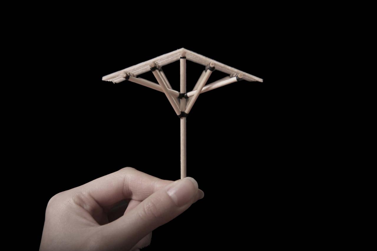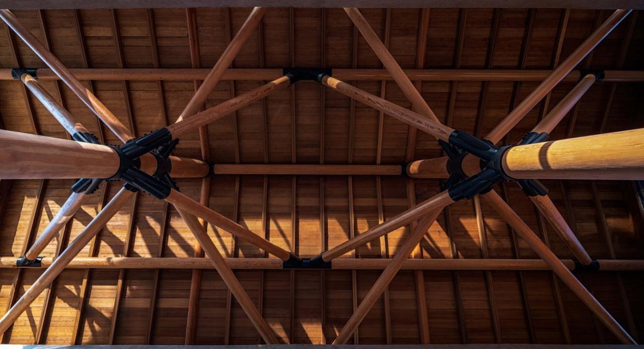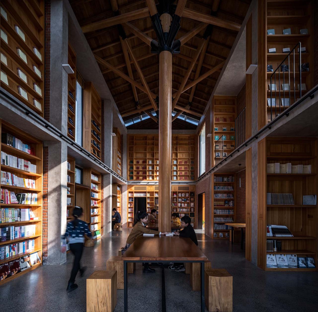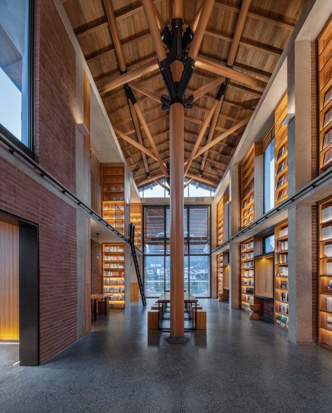 设计中,我们将建筑靠近景观的主楼西侧内部一二层打通,通过构造柱及圈梁等结构加固方式达到整体结构的稳定性,再将两棵“大树”植入其中,支撑新的屋顶的同时形成一个独特的阅读空间。“大树”结构借鉴了何陋轩的处理方式:空间上通过并置的两棵树形结构,统领了内部空间;节点上通过黑色钢构件,强调了木构件之间的连接效果;柱子落地方式上,延续水磨石地面,以圆润的方式适当抬高形成柱础,达到对木柱的保护效果;灯光通过与钢构件整体设计的方式,照亮屋架及屋顶的同时达到隐藏的效果。内部的木构架支撑了整个屋面,与下部结构适当脱开,形成漂浮感。内部细腻的木结构体系通过玻璃内透出来,与外立面粗粝的砖石材质形成对比。