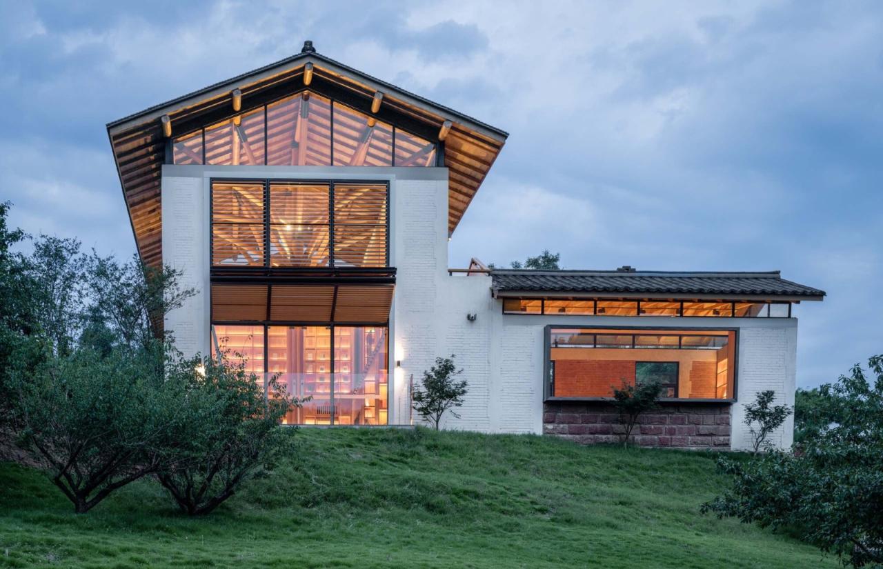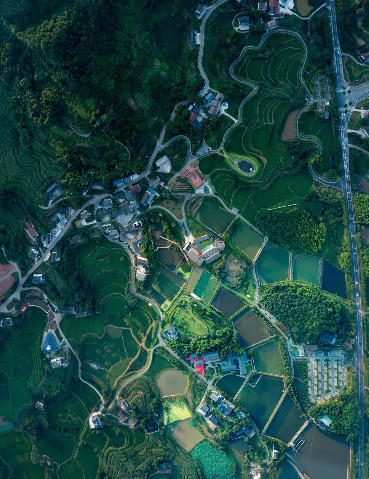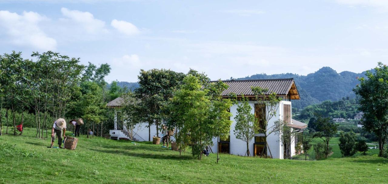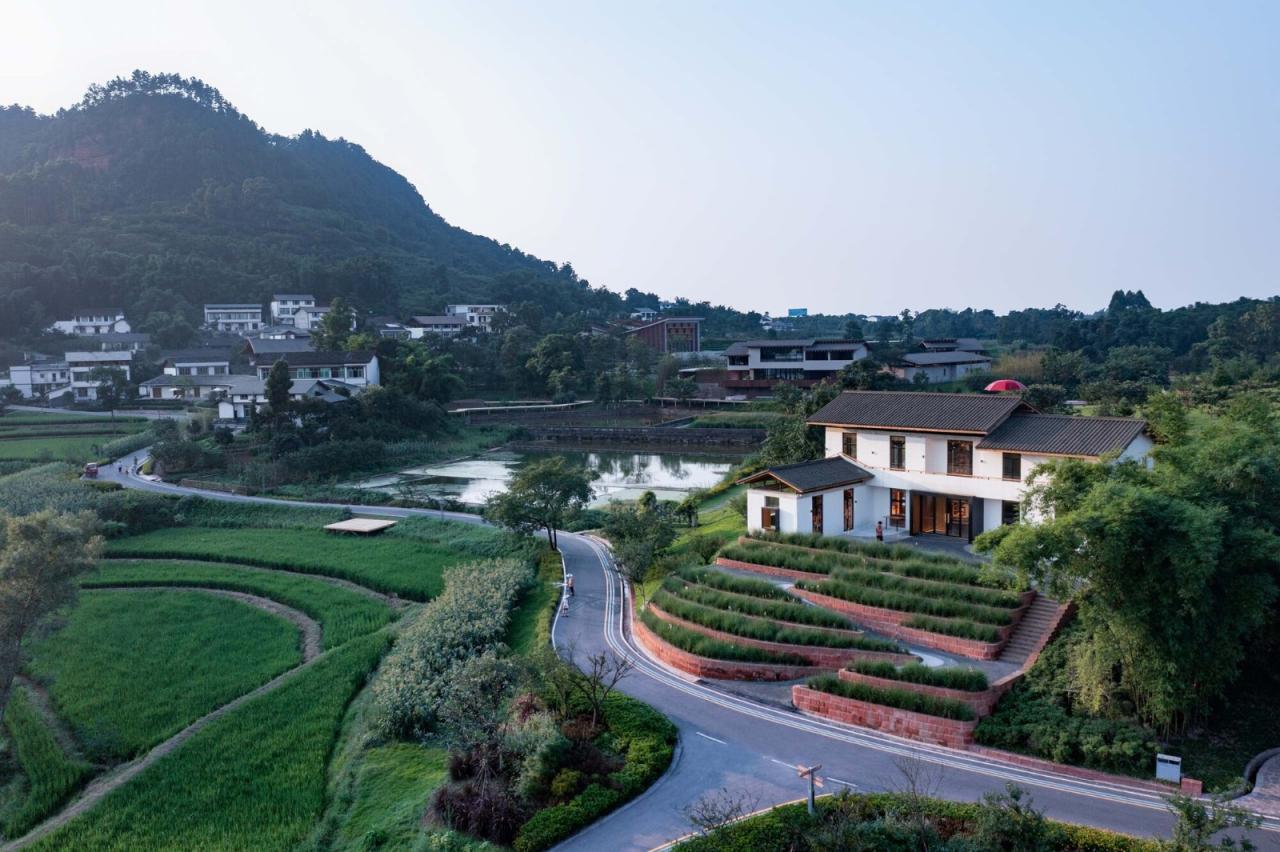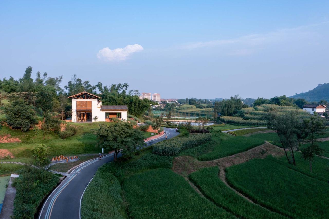 四川宜宾安石村,一个普通乡村,背靠碾盘山。村落阡陌相通,田塘错落,屋树交织,是典型的川南聚落。乡村书局位于安石村中心位置,三条道路交汇之处,场地与道路有4m的高差。建筑面对稻鱼共生区,建筑背后为开阔缓坡。
