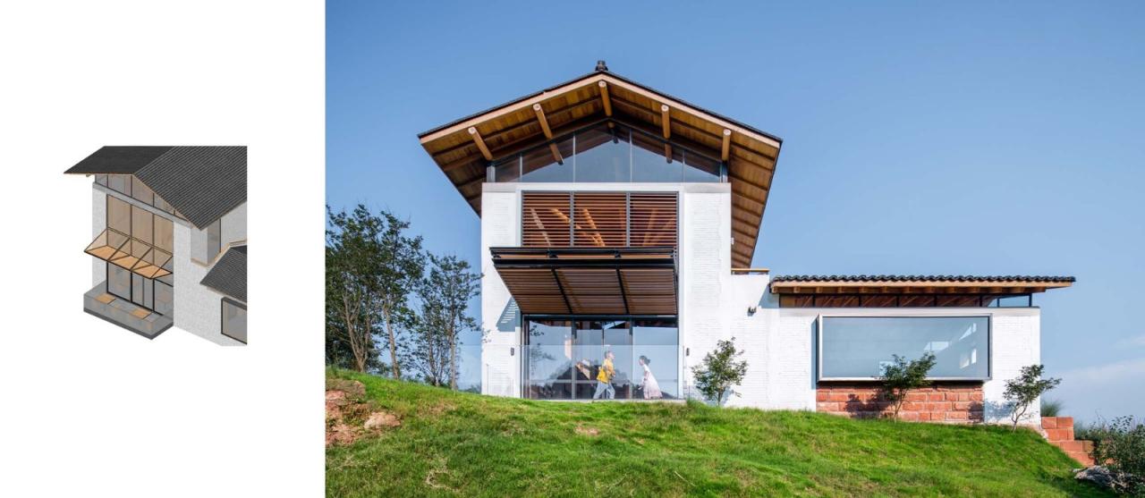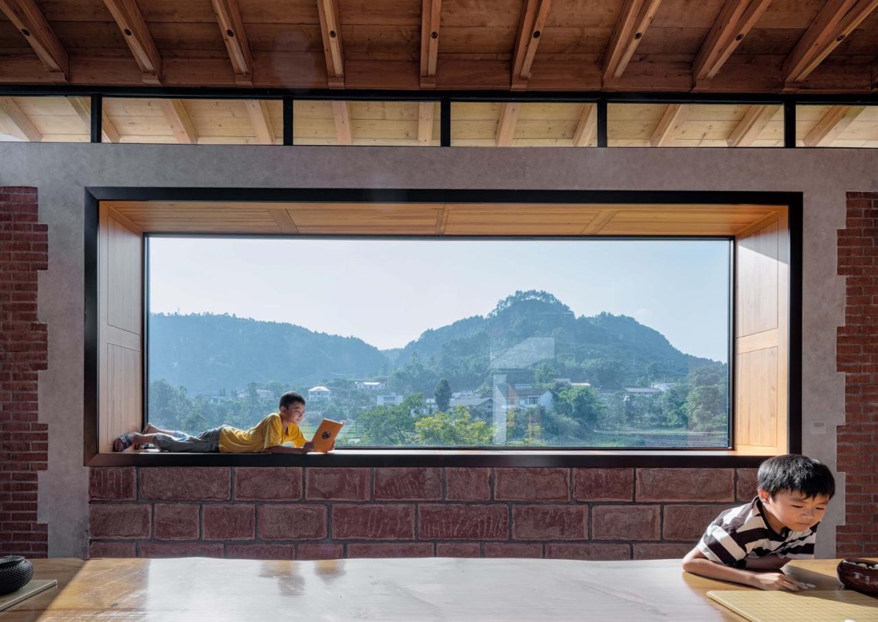 考虑到日照对阅读的影响,在建筑南北两侧设计了不同的阅览空间类型:建筑南侧,为避免阳光直射,座位采用侧向窗户的排布方式面对而坐;建筑北侧,无阳光直射,景观视野良好,将座椅正对窗户布置,阅读之余可观赏山坡景色。建筑西侧直面山景,我们采用了大玻璃面将景观引入室内,外立面设置的电动遮阳百叶,打开和关闭时候以不同的表情面对环境的变化。原有建筑南侧一层部分,改造为会议室,上部为木屋架,西侧横向的大玻璃窗将碾盘山景色一览无余的引入到室内。