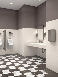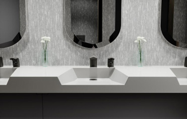 Designer Series 前开口式水槽 DSOF-84000,采用深白色可耐丽面材,搭配石墨黑表面的 ETF-410水龙头和ESD-410皂液器。商业建筑物中卫生间是最明显和最常被访问的地方,因此除了满足顾客的如厕需求之余,还要重视设计感和使用体验感。SLOAN仕龙针对不同商业环境设计提供的表面处理,不仅给卫生间带来更丰富的色彩和质感,其PVD工艺能够保护产品免遭刮擦和腐蚀,保证产品的持久性和长期的一致性。同时,在高客流量环境中,洁具每天都会被化学清洗剂频繁地清洁和消毒,采用PVD处理的产品增强了抗化学性和耐磨性,在长时间高频次使用和维护后,依然能保持其设计的美观度。SLOAN仕龙的SloanStone 挂墙式倾斜式水槽 ELGR-82000,搭配镀镍拉丝表面的EAF-250 水龙头和ESD-2000皂液器以及EHD-701挂墙式干手机,保证整体设计风格统一的同时,卫浴产品表面的特殊处理工艺在面临高客流量访问使用时,水龙头残留的指纹和水渍仍然较少,始终保持洁净,为顾客提供周到舒服的服务。