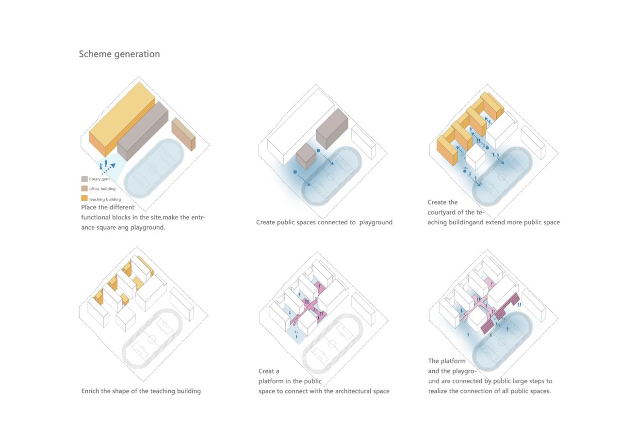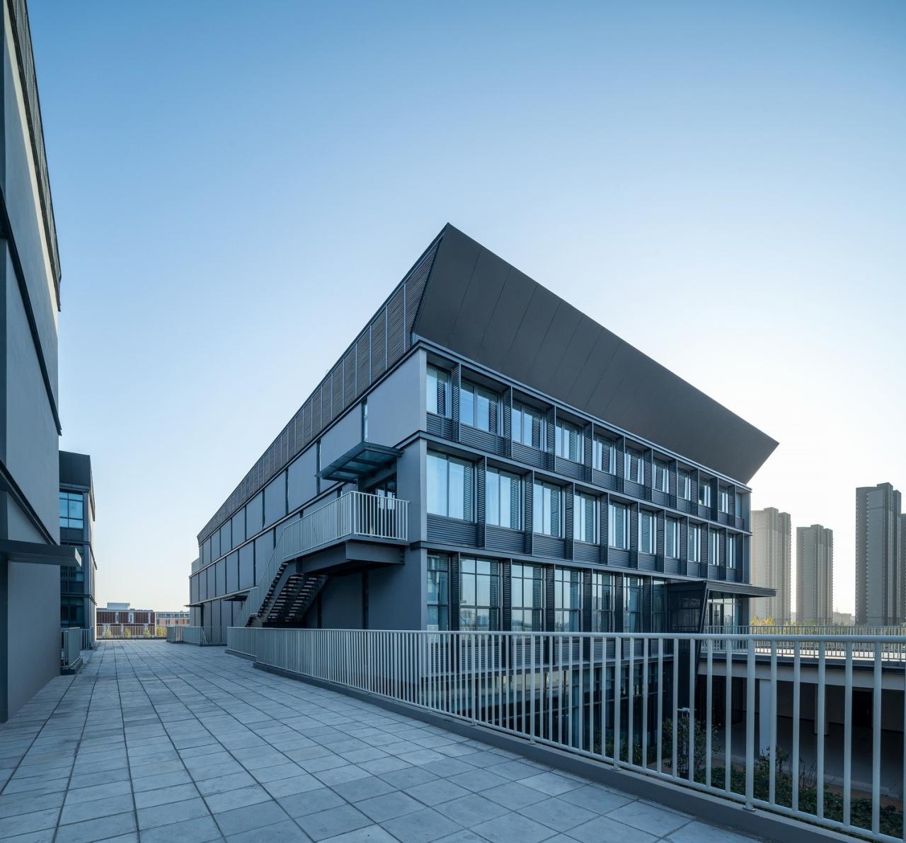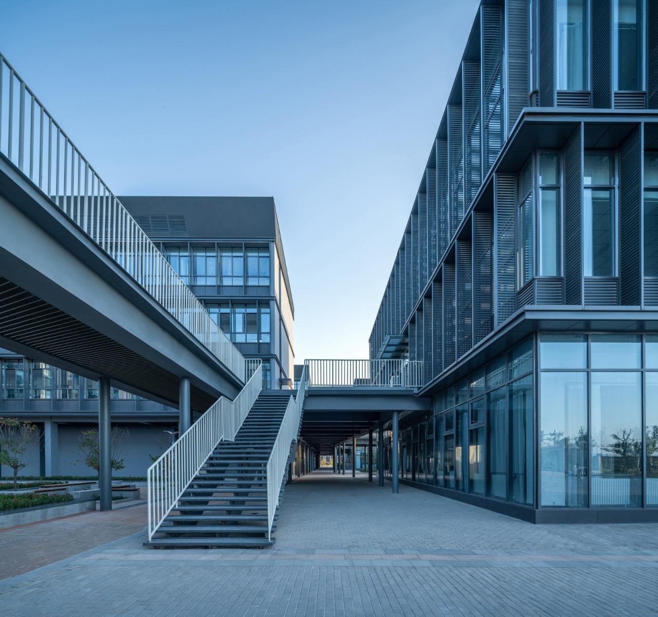 2,相比于传统的学校,功能更集约化,空间感受更公建化,有许多建筑灰空间来提供交流场所,并且引入了隐性课堂和扩大的共享空间。二层的室外活动平台把教学楼、体育馆、食堂进行串联形成学生自己的活动中心,通过主体连廊的架空以及建筑体量的穿插、进退,在提供教学场所的同时,营造丰富的室内外活动场地,引导学校教育模式的革新。