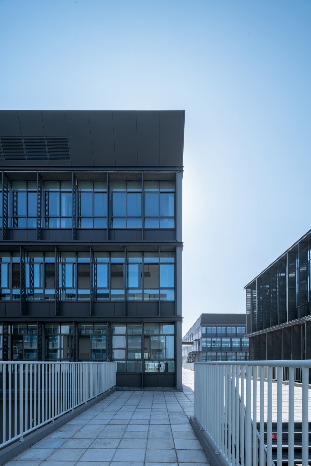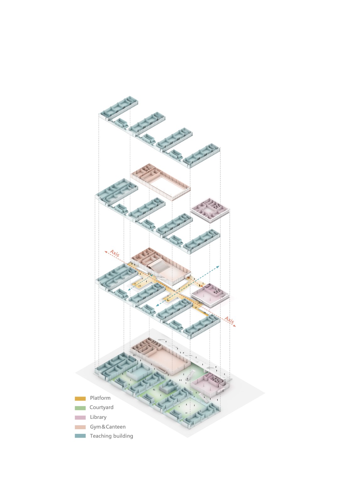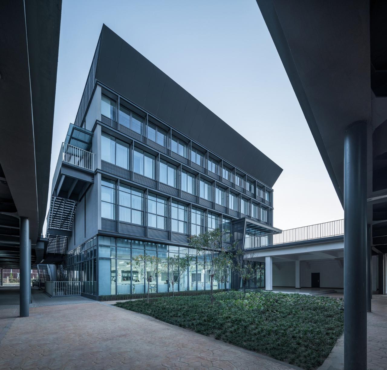 2,相比于传统的学校,功能更集约化,空间感受更公建化,有许多建筑灰空间来提供交流场所,并且引入了隐性课堂和扩大的共享空间。二层的室外活动平台把教学楼、体育馆、食堂进行串联形成学生自己的活动中心,通过主体连廊的架空以及建筑体量的穿插、进退,在提供教学场所的同时,营造丰富的室内外活动场地,引导学校教育模式的革新。